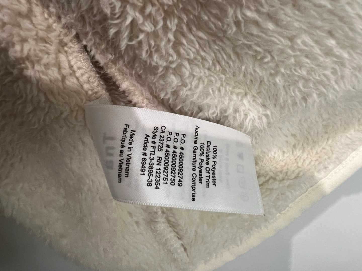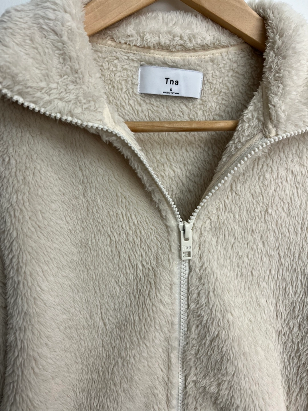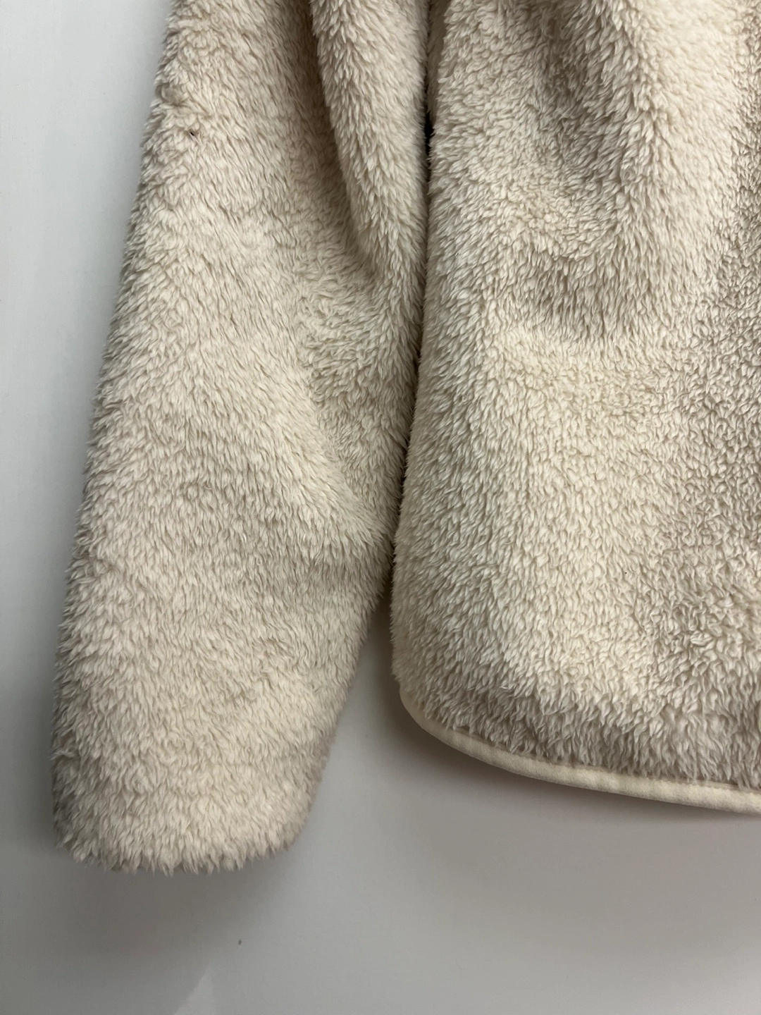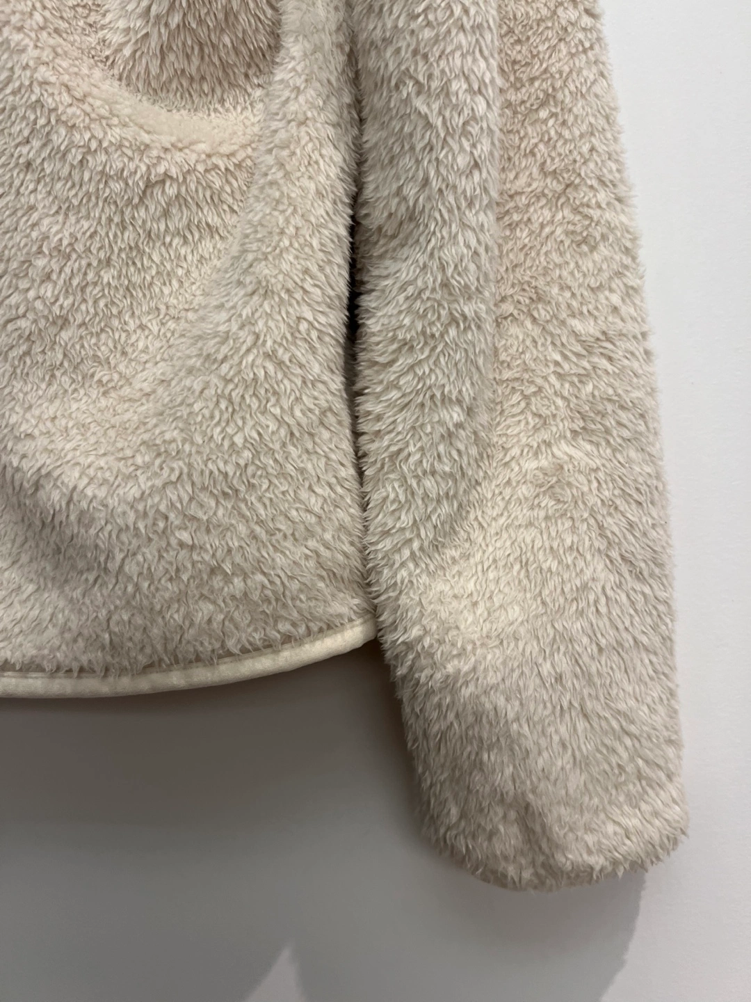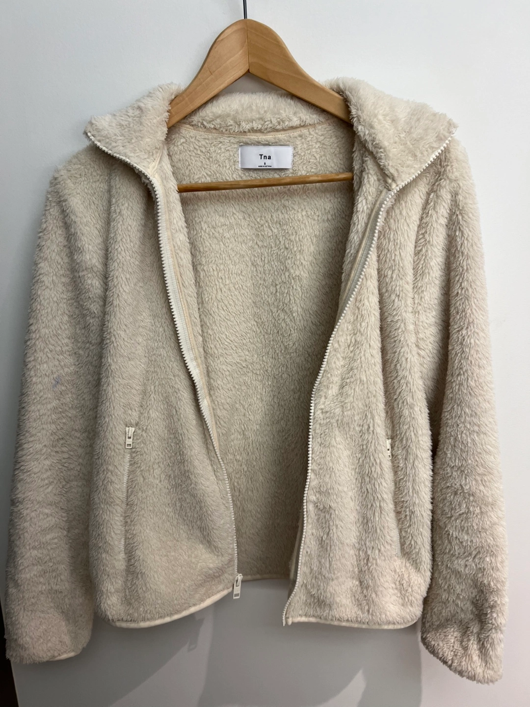 52Cream coloured fuzzy zip-up jacket. Long sleeves. Two front pockets. Pick up near Metrotown