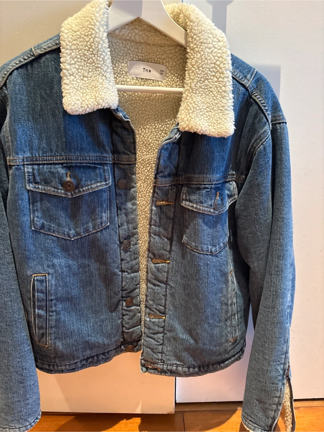 54Selling a Tna denim jacket in size XXS. It features a cozy sherpa lining and collar, perfect for adding a bit of warmth and style to your outfit!