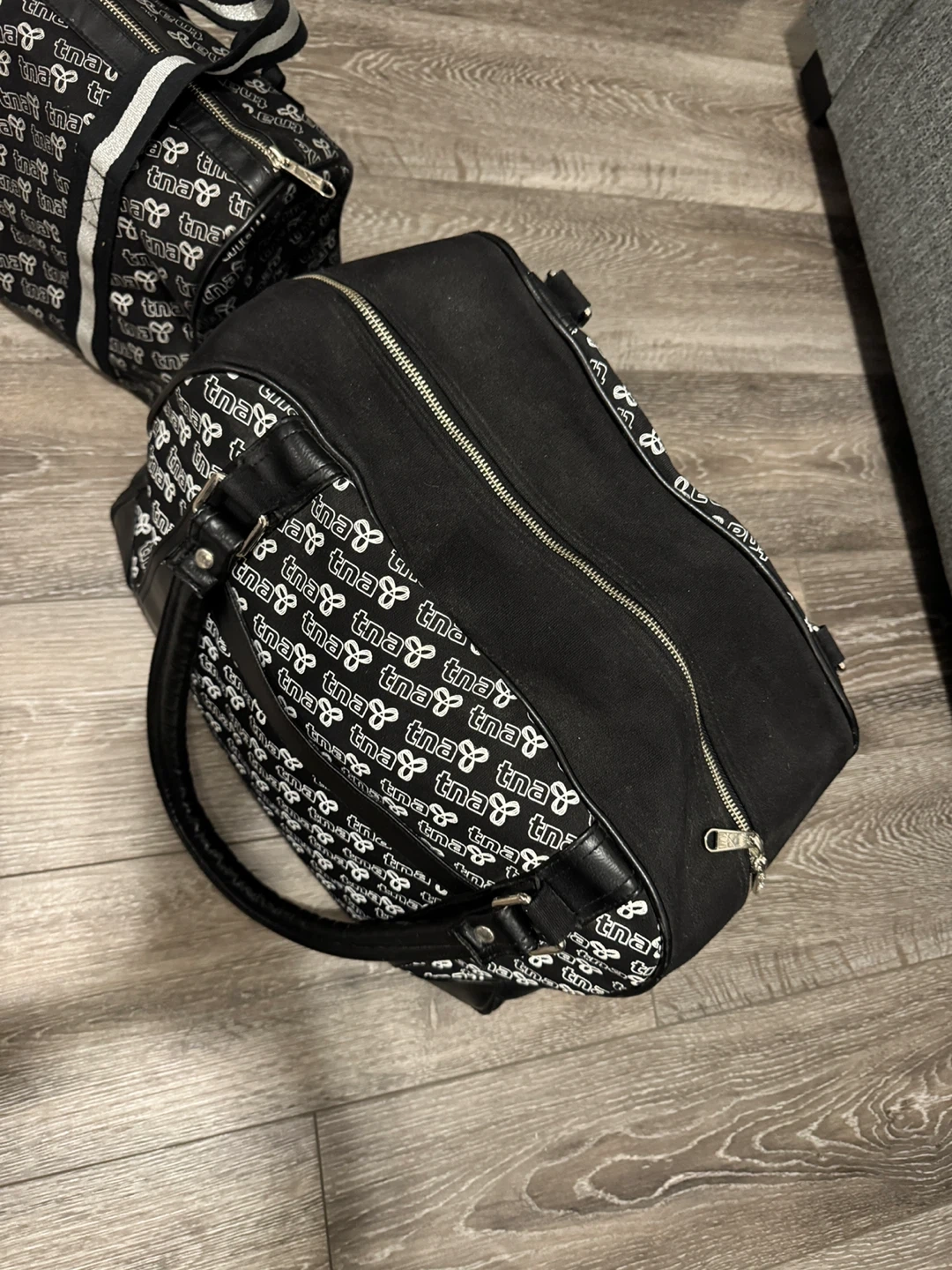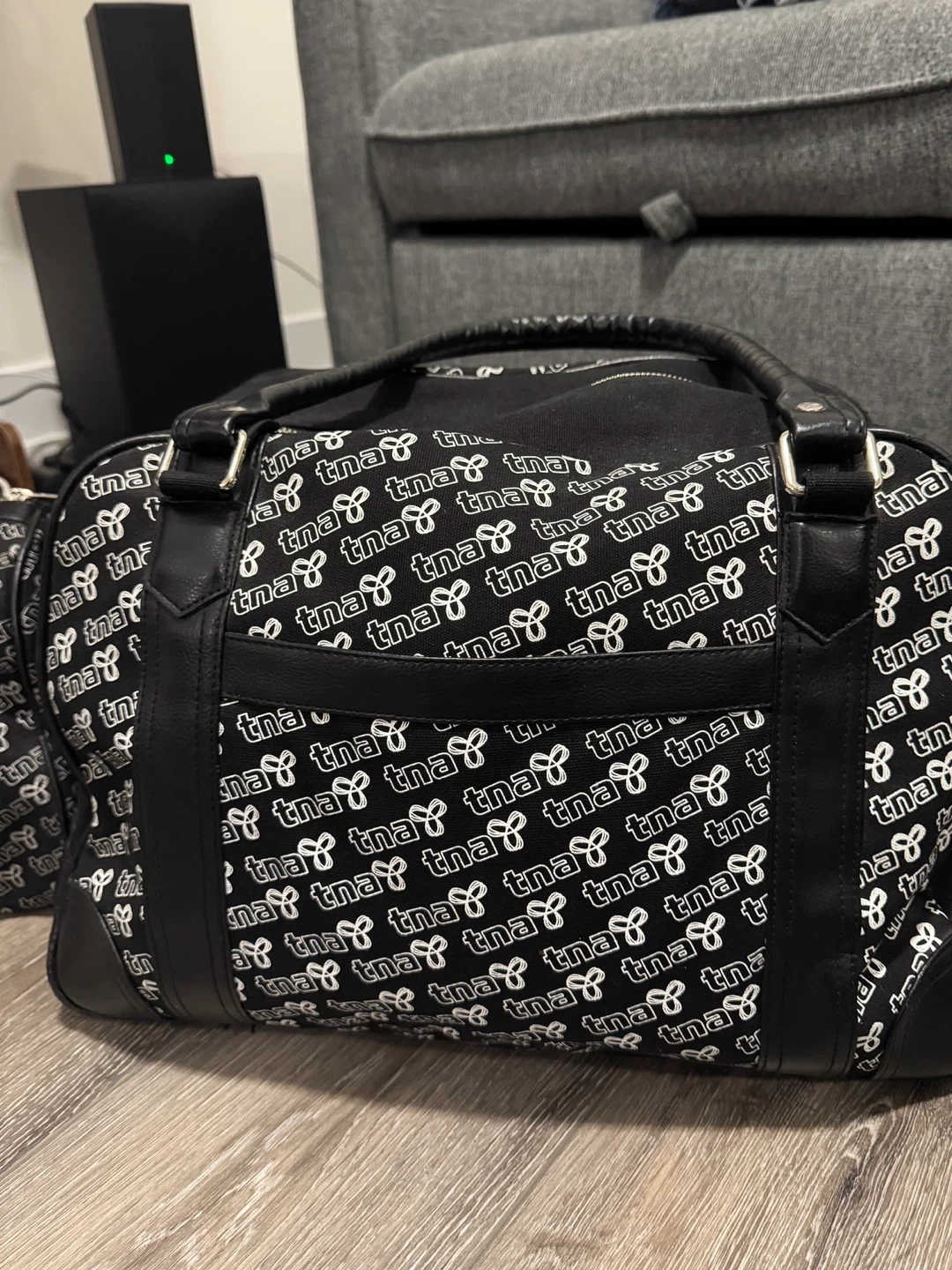 Selling an original retro TNA bowling bag featuring a black and white pattern. This has been used twice. It's in great condition and perfect for travel or gym use. The bag is durable and has plenty of space for your belongings. The TNA logo is patterned all over the bag. Free mini TNA bag with purchase.