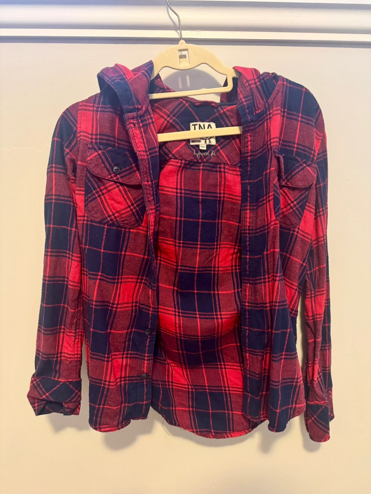 0Cozy TNA flannel button-up shirt in a red and black plaid pattern. Perfect for layering or wearing on its own! Bought a while ago, worn once or twice. Mint condition - no stains or tears. Size: XXS