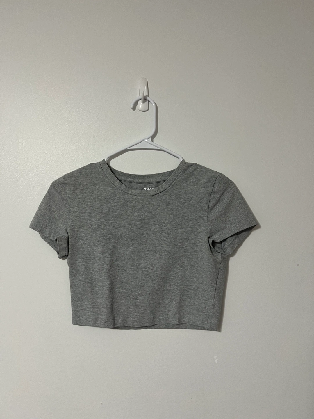 71Selling a cute TNA cropped t-shirt in a versatile gray colour! It's in great condition and perfect for everyday wear. The size is not visible, but it looks like a standard size.