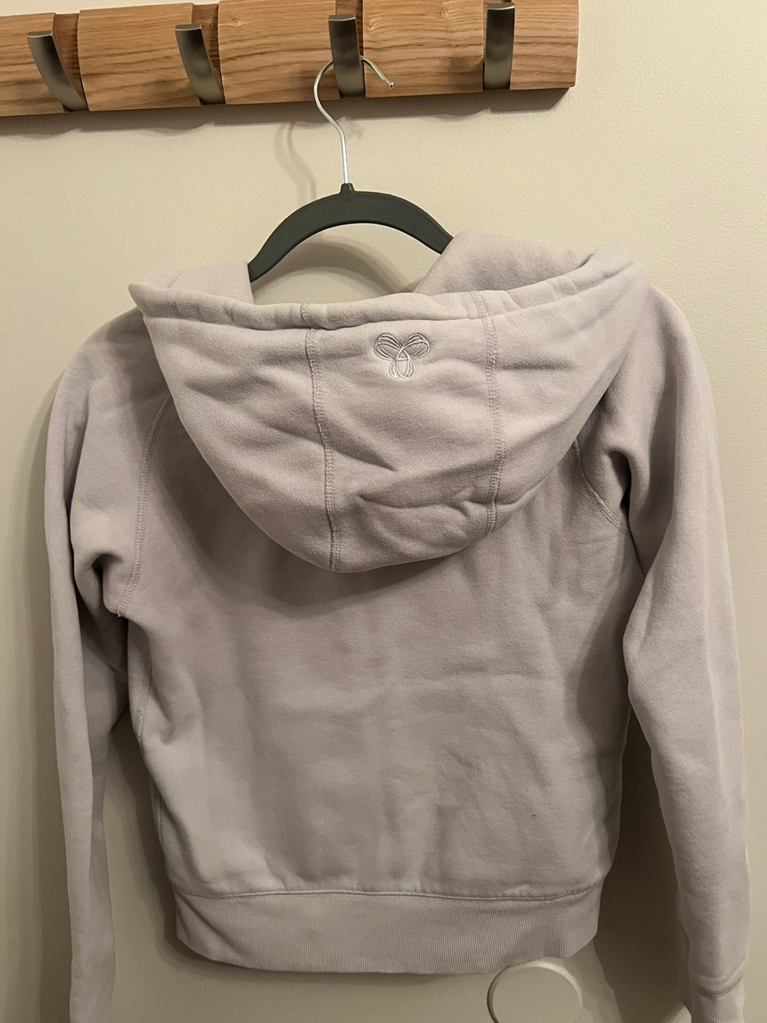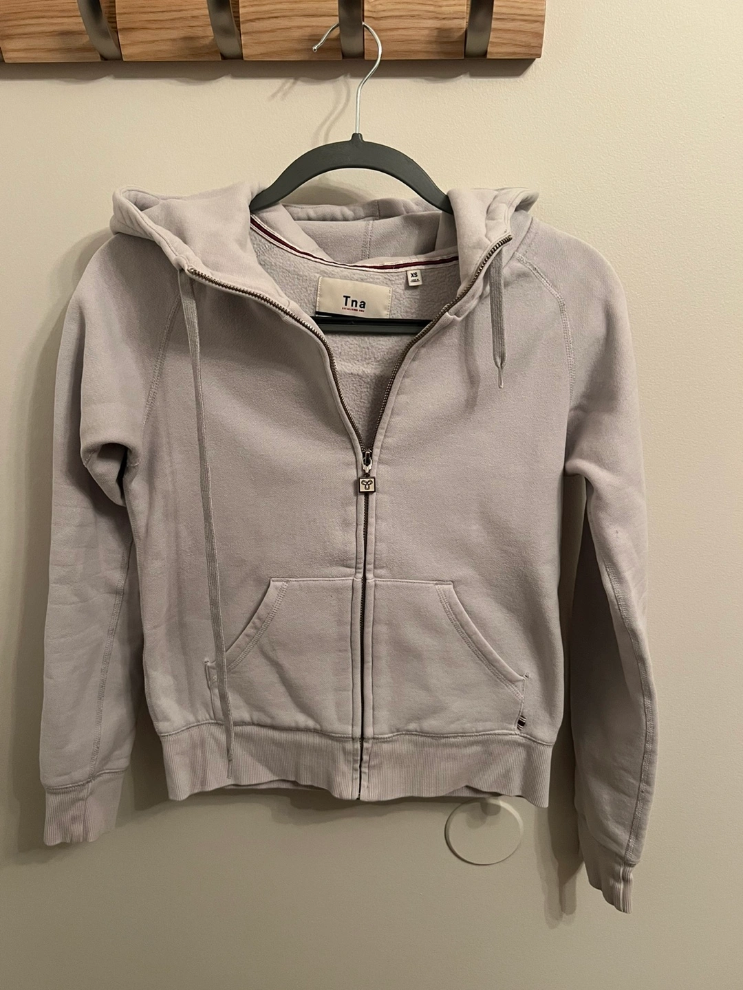 Selling a TNA zip-up hoodie in a lovely light grey colour! It's a size XS. The hoodie is in great condition and features the TNA logo on the zipper and back of the hood. Perfect for layering or wearing on its own!