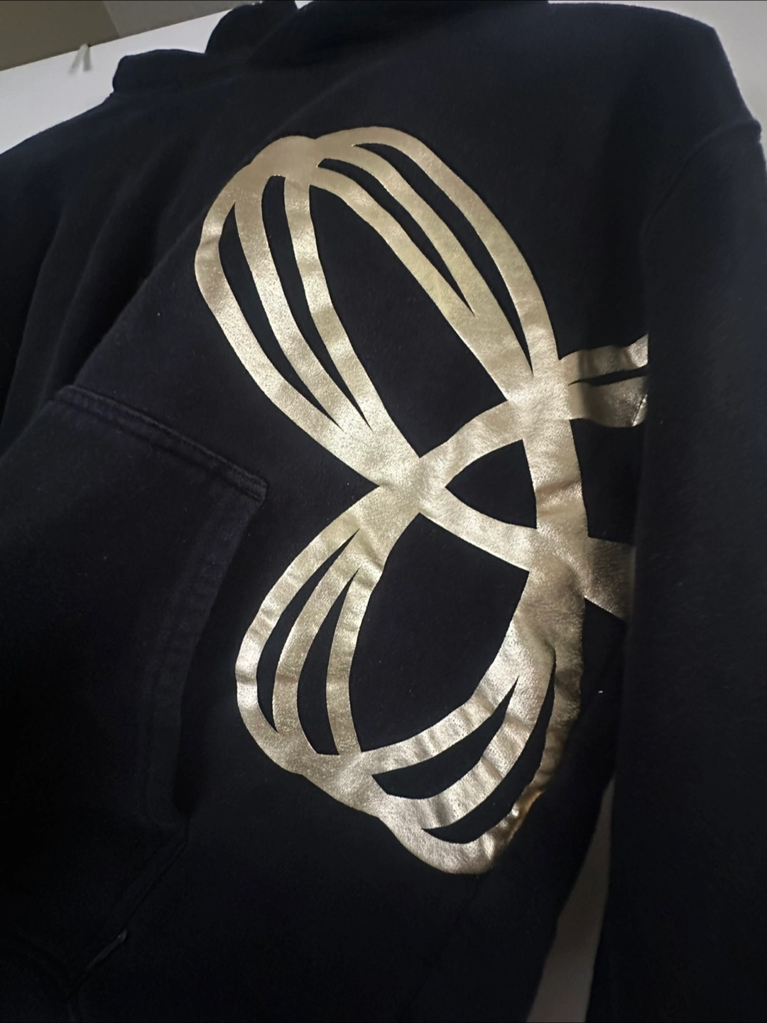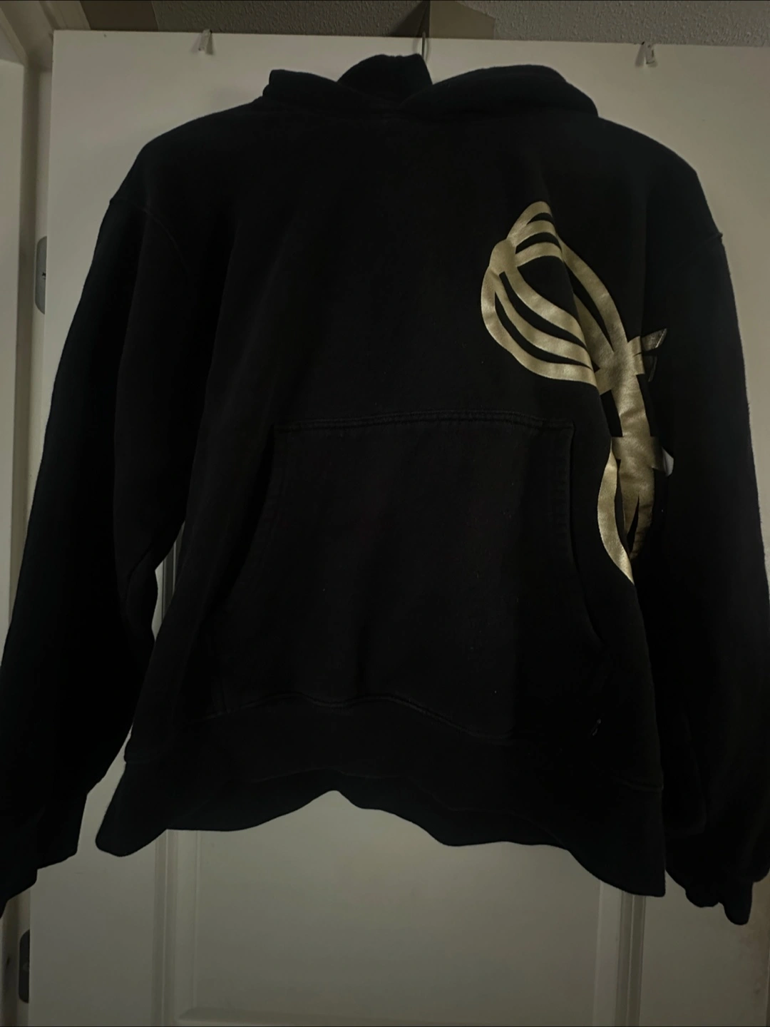 5Black pullover hoodie. Features a gold graphic design on the front. Long sleeves and a kangaroo pocket. Good condition.