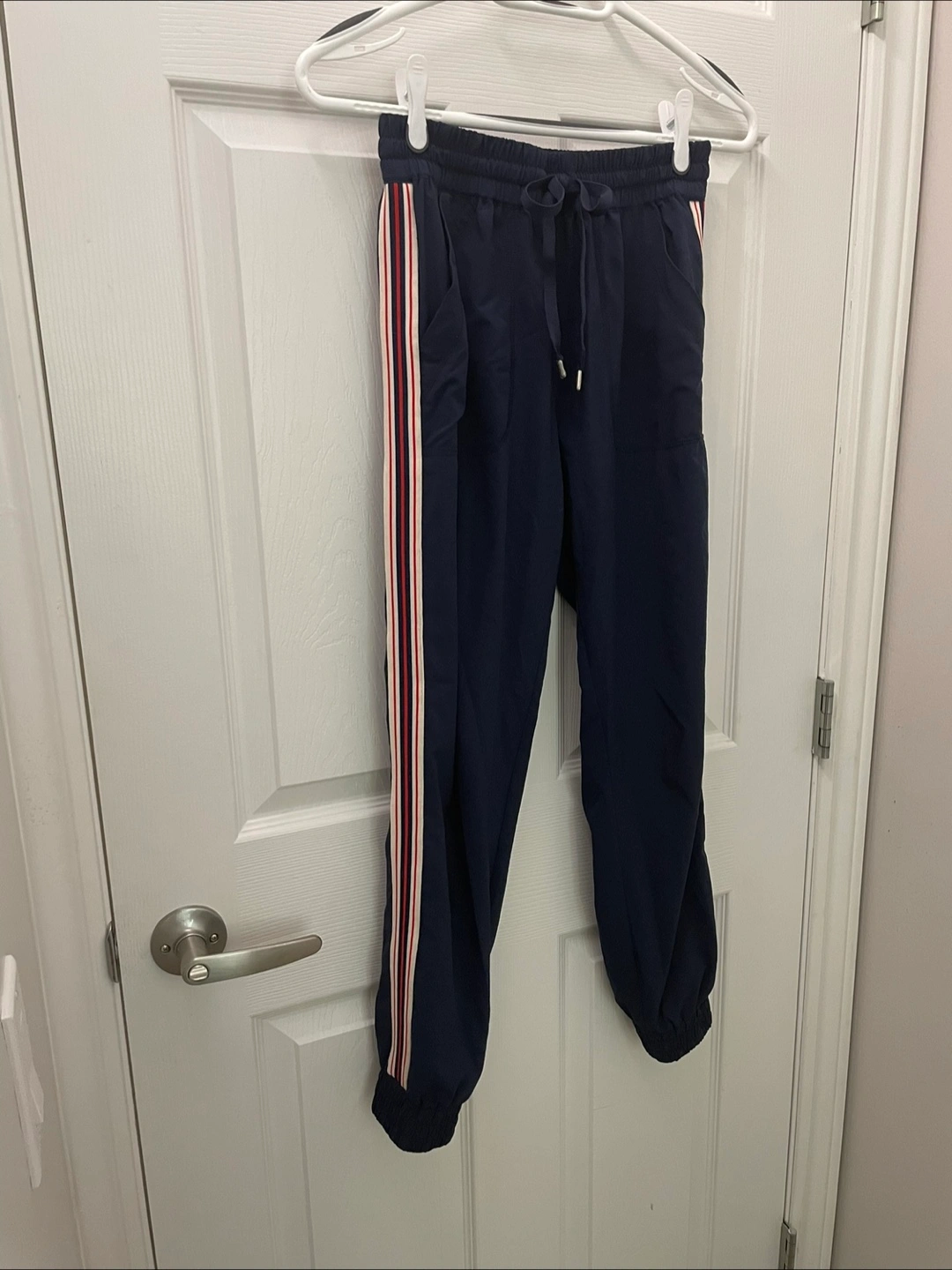 *I’m trying to clear out my closet, so I’m open to offers! Selling a pair of TNA navy blue joggers with stripe detail down the sides, in excellent condition. They're a size XS and have adjustable drawstrings at the waist. Very light weight and breathable, perfect for lounging or running errands!