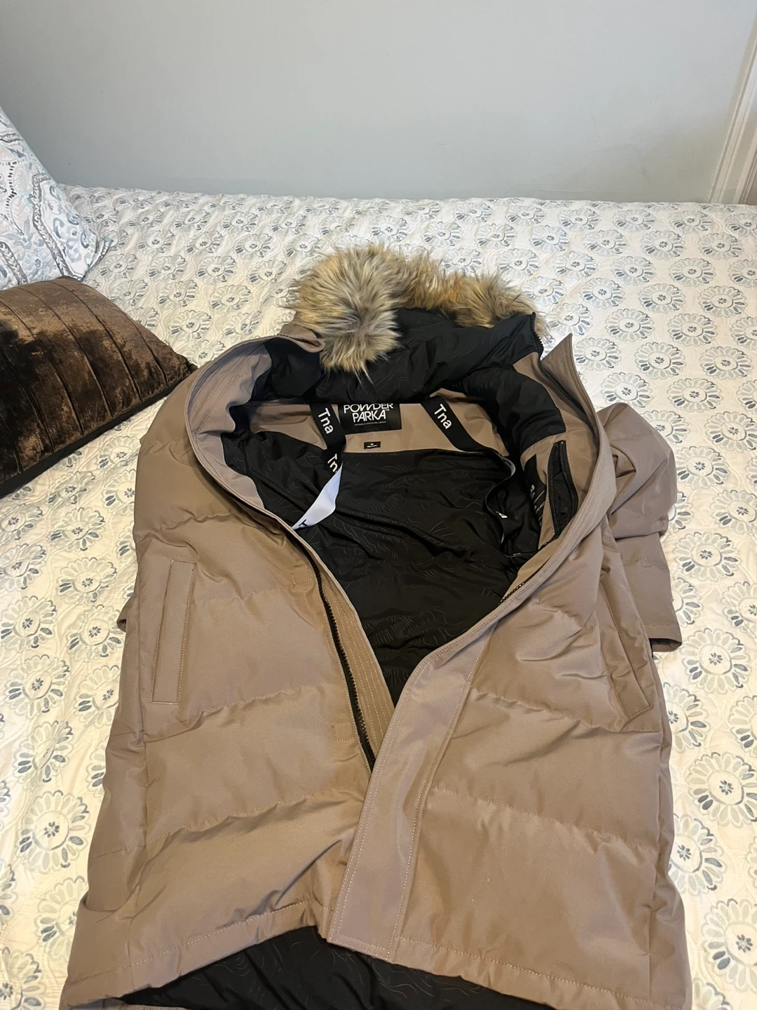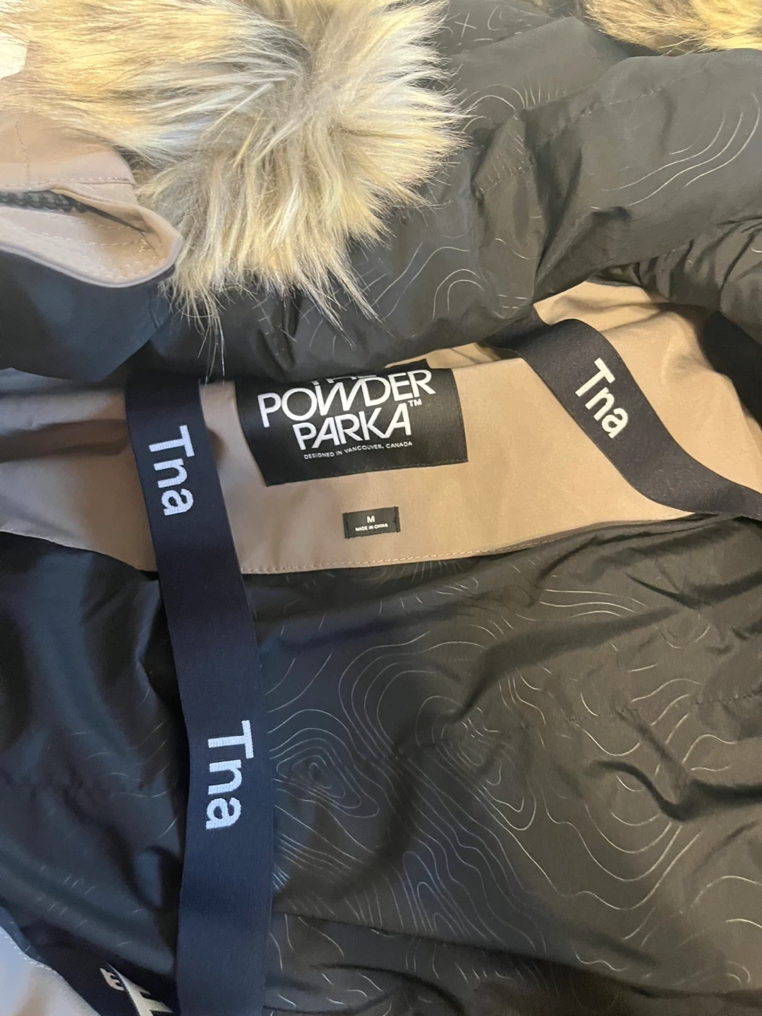 11Selling a Tna Powder Parka in excellent condition! Size: M Colour: A neutral, light brown/beige This parka is designed in Vancouver, Canada and features: - 700+ Fill Power for superior warmth - Responsibly Sourced goose down fill - Coldstop fabric: Waterproof and windproof