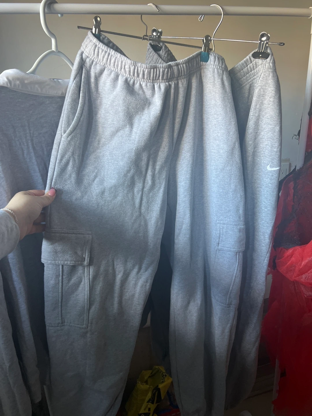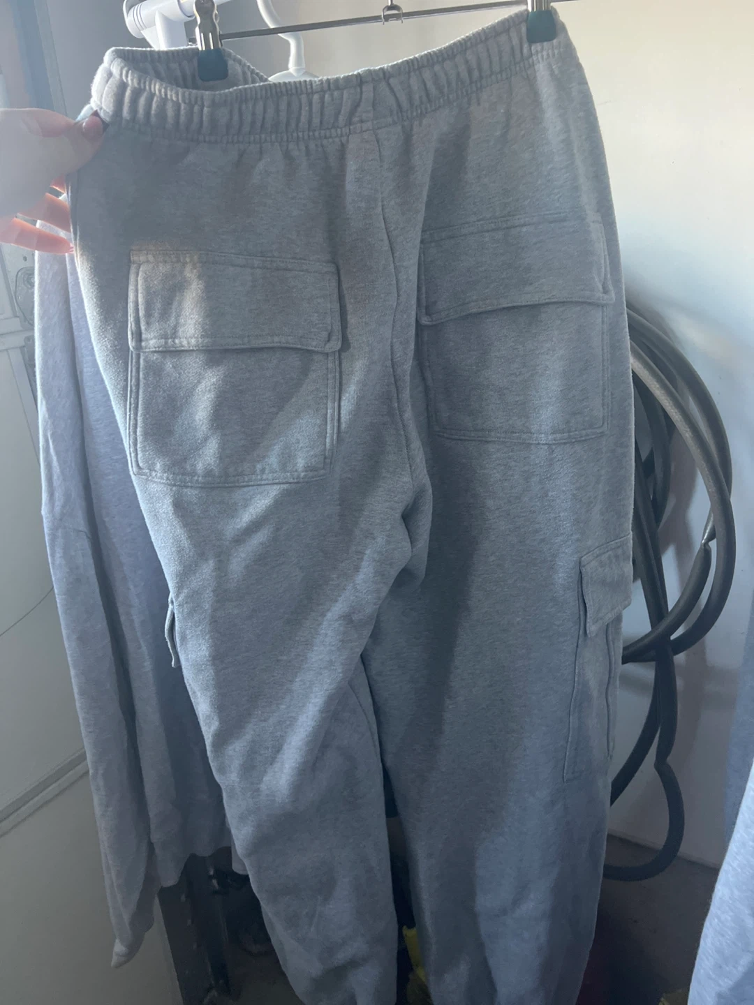 10Selling a pair of TNA Sweatfleece Cozy Fleece cargo sweatpants in a size medium. They're the Mega Fit style and are a light grey colour. Perfect for lounging around or running errands!