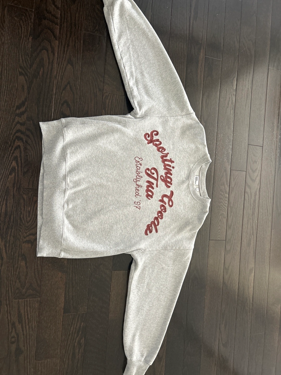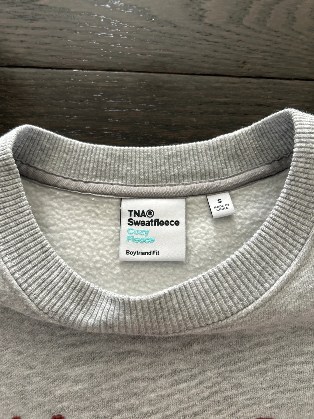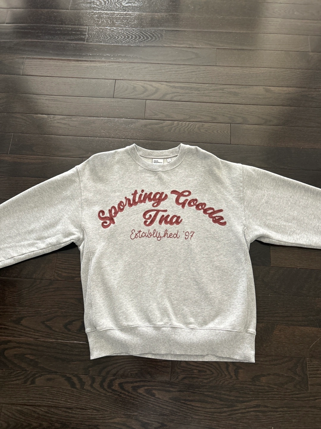 TNA Sweatfleece crewneck in a light grey colour. It's a size small and in good condition. The front has a 'Sporting Goods TNA Established '97' design in a burgundy colour. It is a boyfriend fit and is fairly warm. Lightly used.