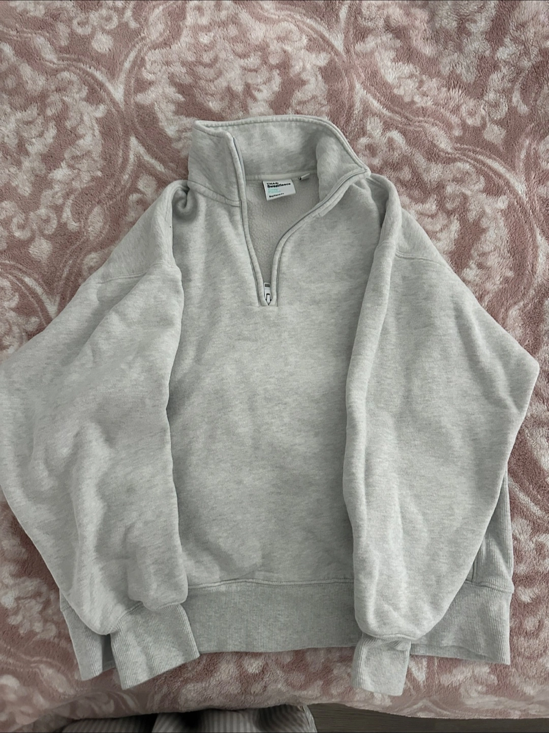 Selling a TNA sweatfleece pullover in a light grey colour! It's in great condition and super comfy for lounging around the house or running errands. The material is soft and cozy, perfect for the cooler weather we've been having