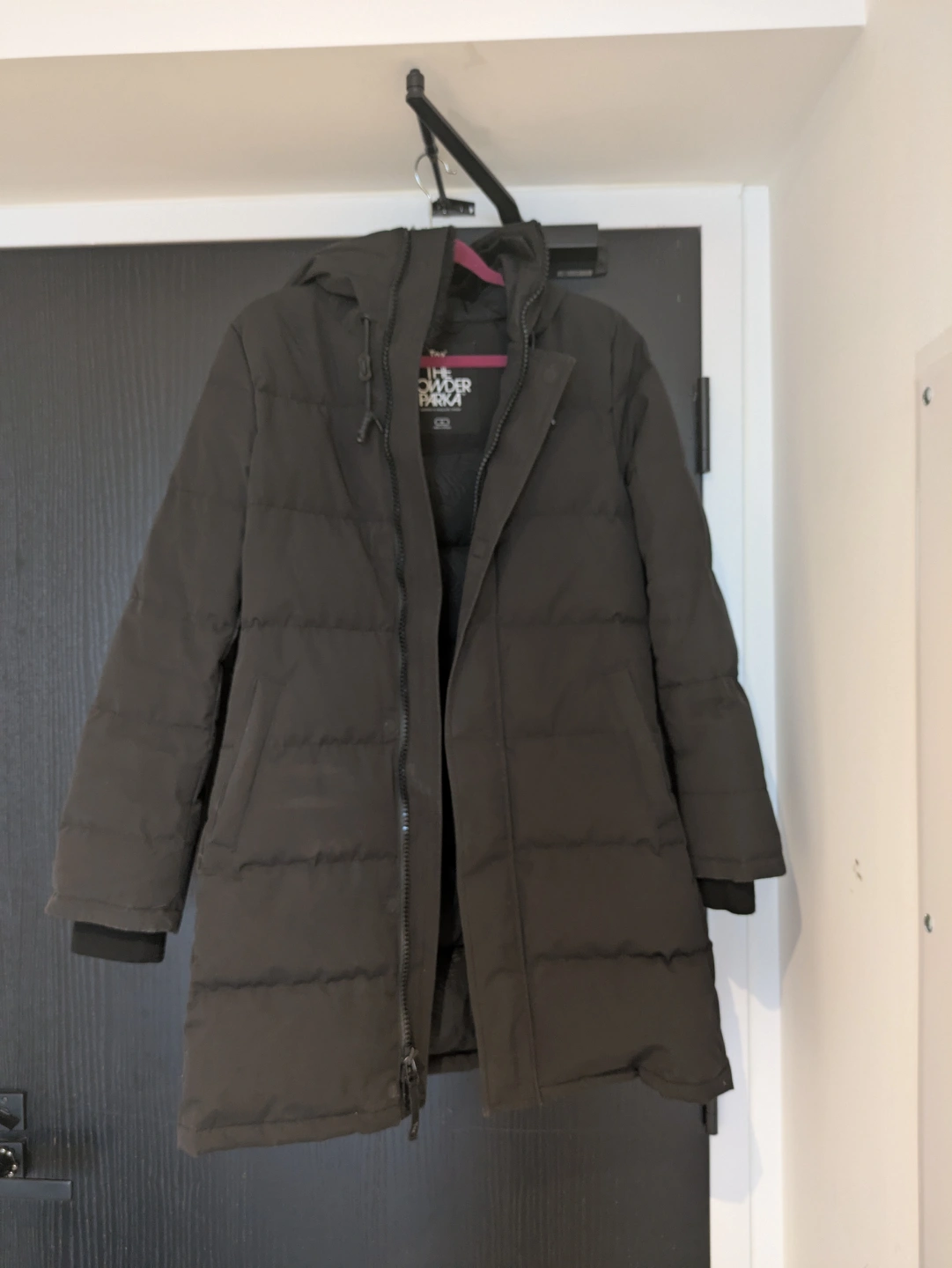 172Black Tna The Powder Parka. Size medium. Features a lined hood. Long length. Excellent for colder weather. Designed in Vancouver, Canada.