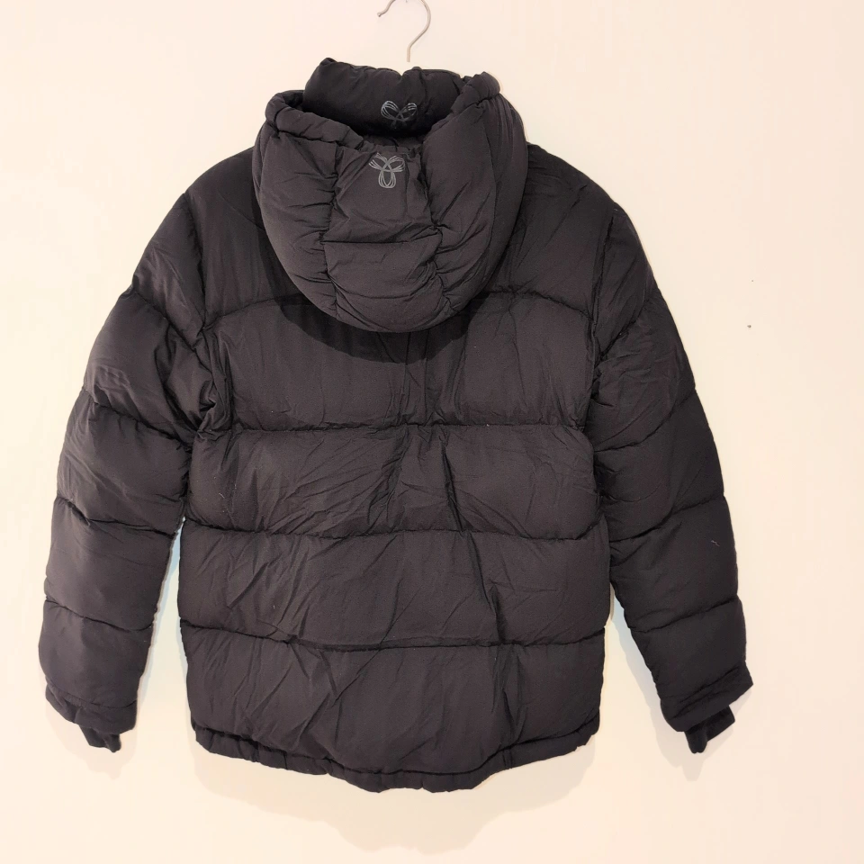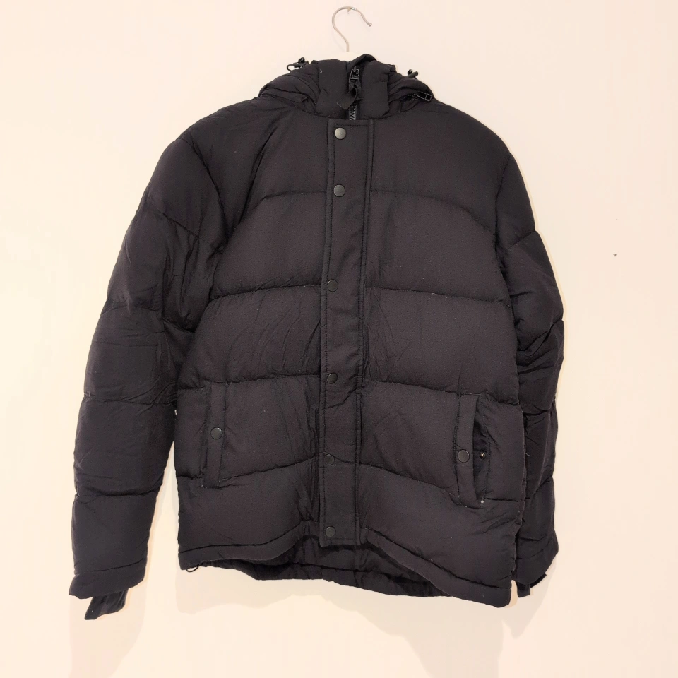 498Black puffer jacket with a hood. Size XS, regular length. Excellent condition.