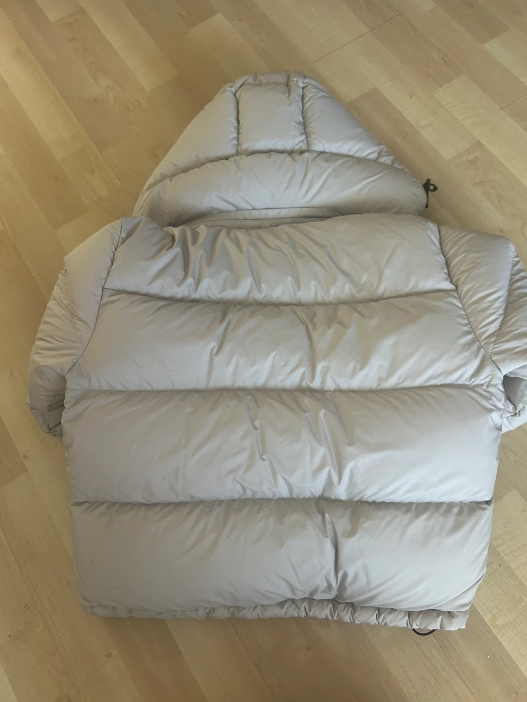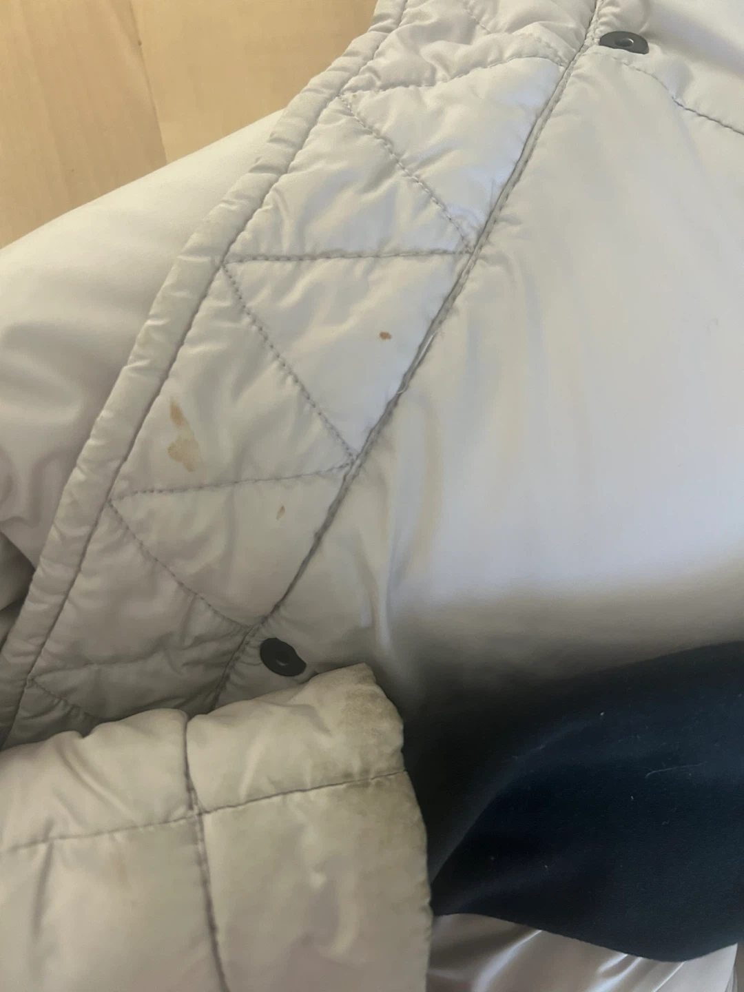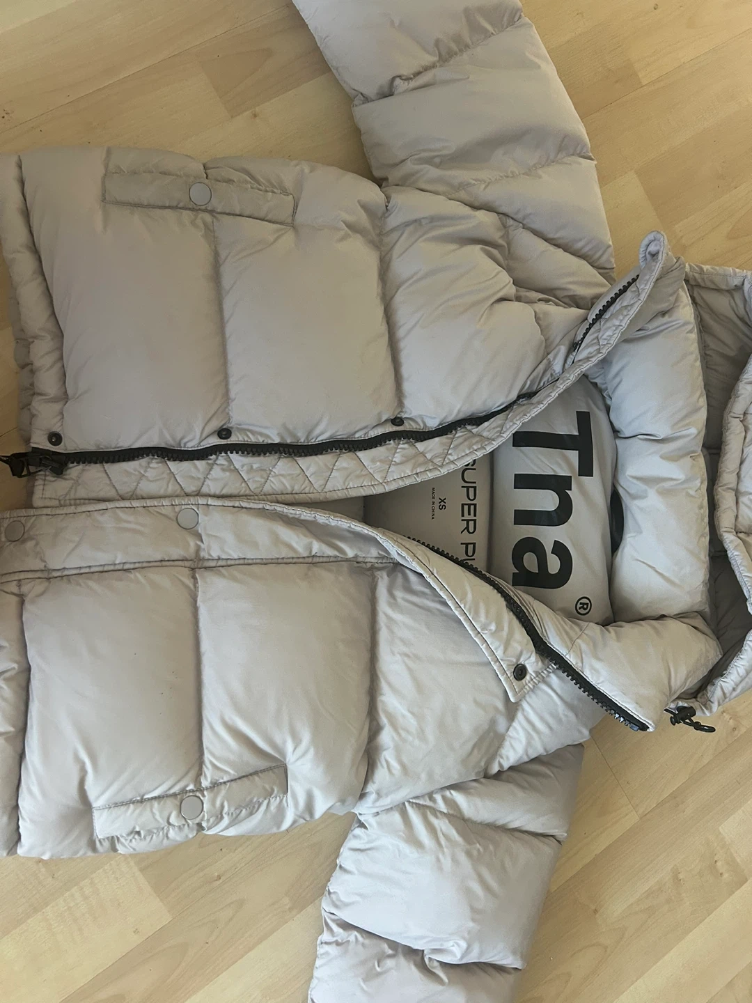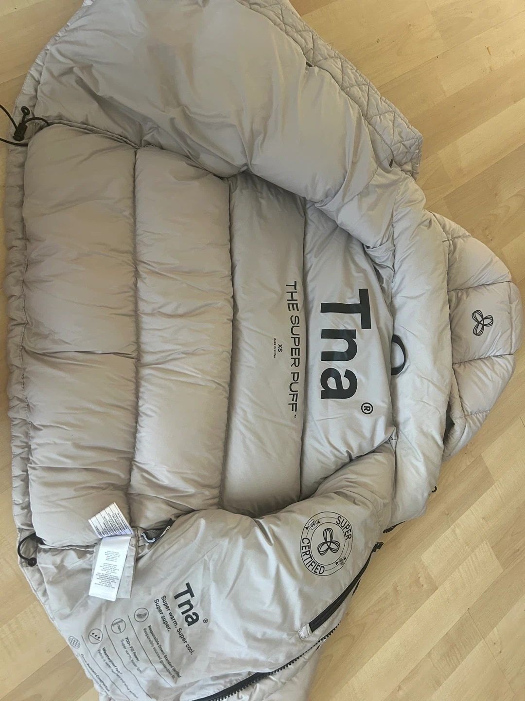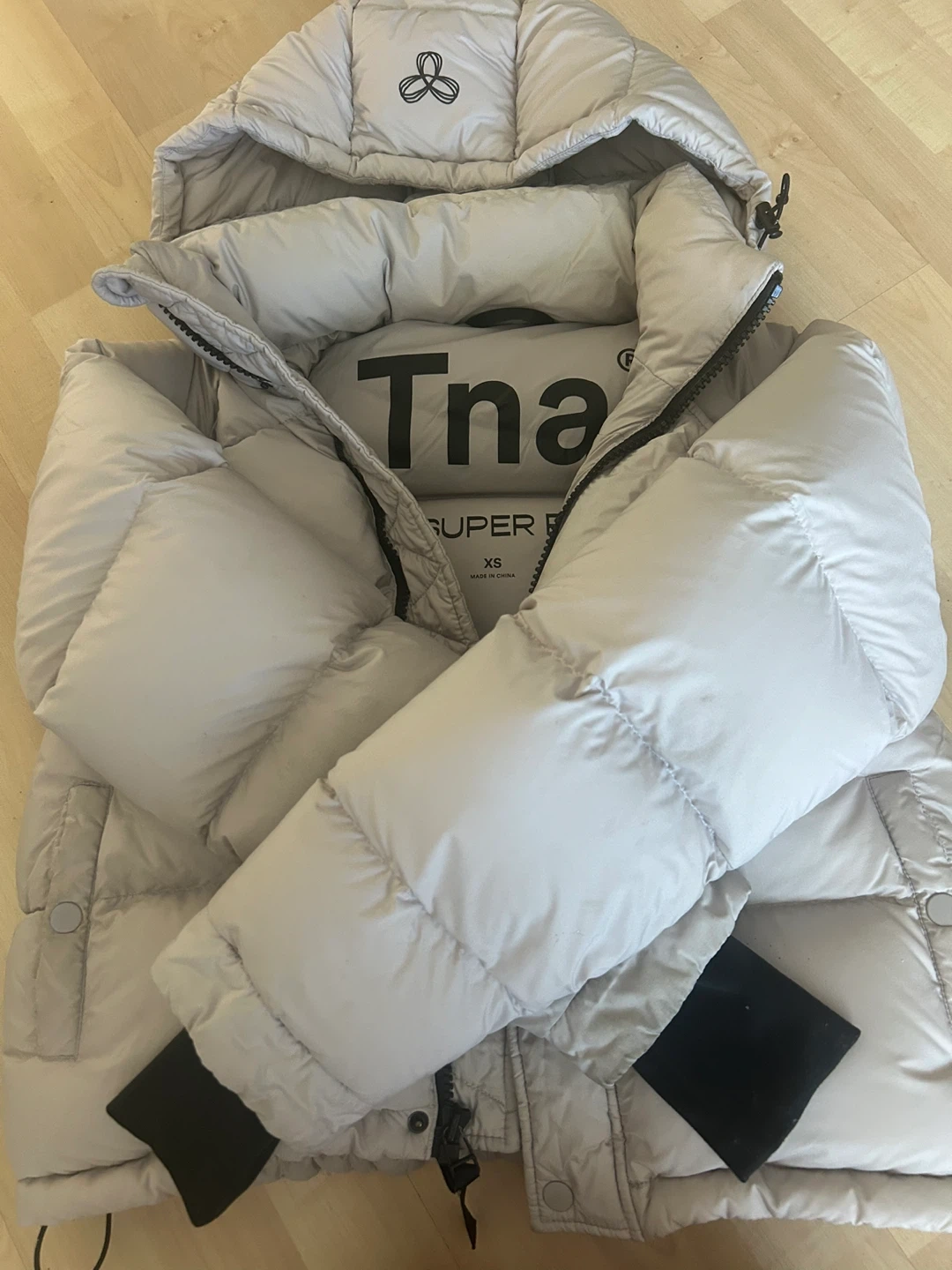 Selling a TNA The Super Puff Shorty in size XS. It has small stains on the front and sleeve, as shown in the pictures.