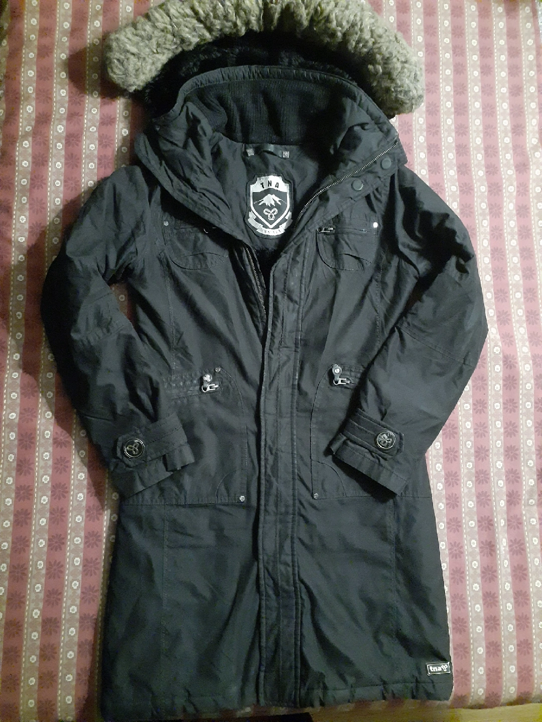 77Size XSMALL... slightly faded but in very good condition Approx 34 inches lenght Removal Hood Front Pockets with zippers Magnetic Enclosures smoke/pet free home will deliver within area