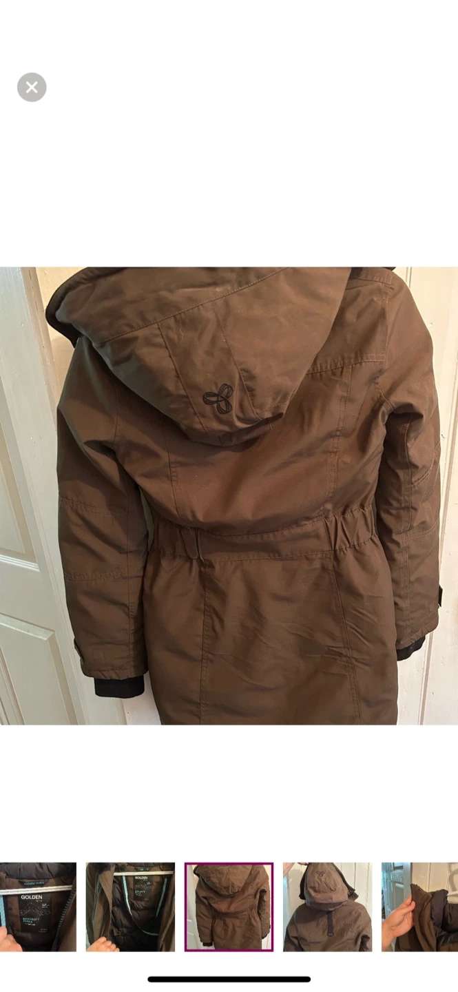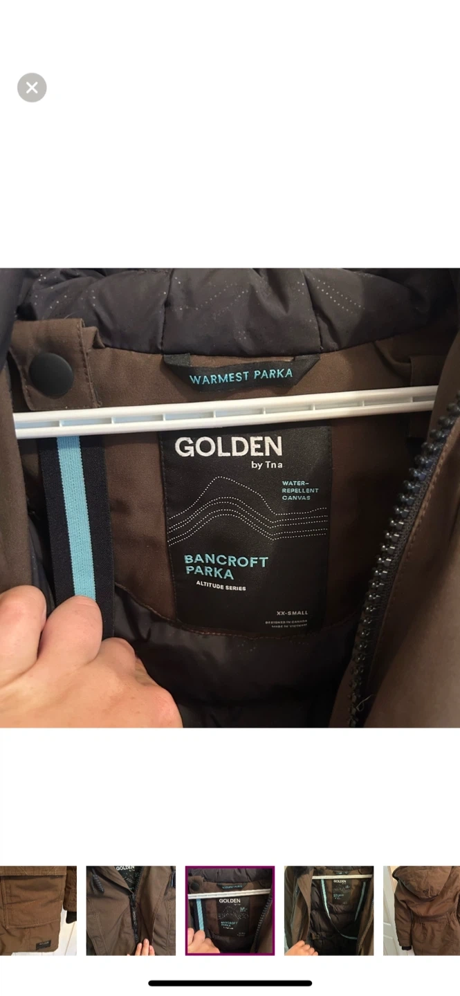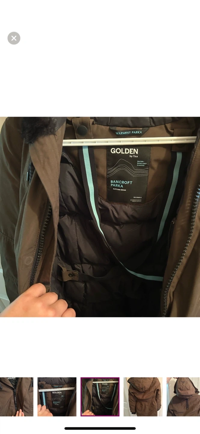 Golden by TNA. The warmest parka zip up hooded winter jacket. Heavy weight. Missing the faux fur hood trim. Dark brown in colour. Size women’s xxs. Brand new condition $100 Pickup between kincardine & ripley or I can arrange delivery in port Elgin-Owen sound, walkerton-Durham, wingham-listowel-kw/cambridge, goderich-bayfield, Woodstock & Arthur-Orangeville-Newmarket-Lindsay-Peterborough AREAS.