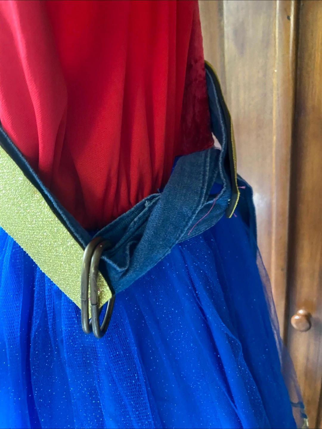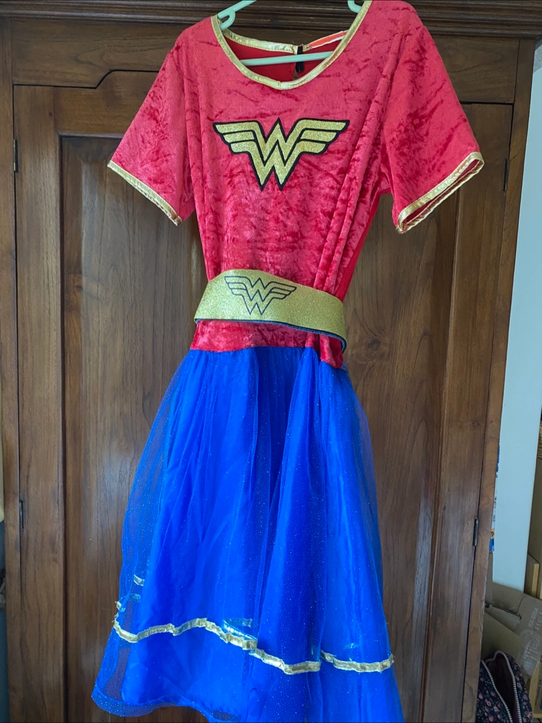 Selling a girls Wonder Woman costume! It features a red top with the Wonder Woman logo and a blue, glittery tulle skirt. A great costume for dress-up or Halloween! In great condition.