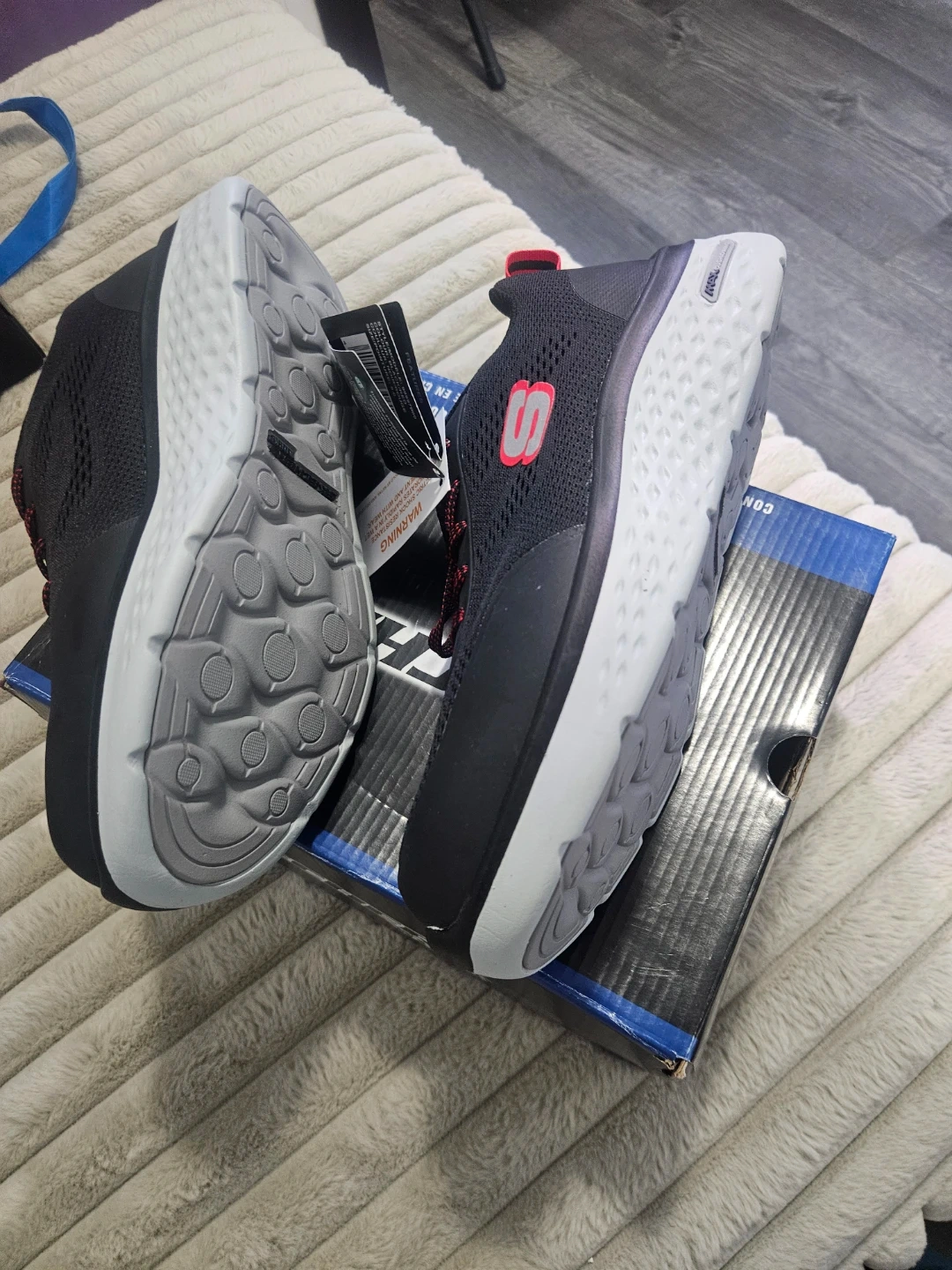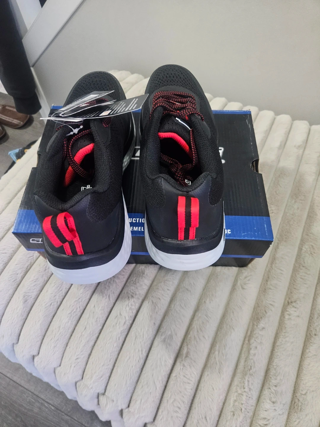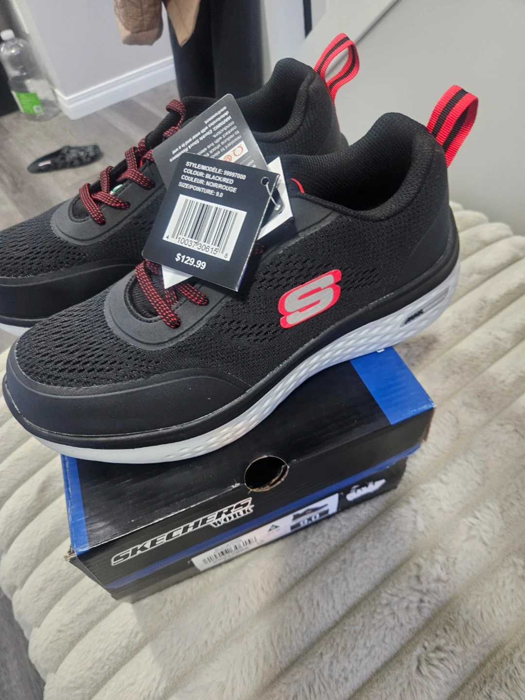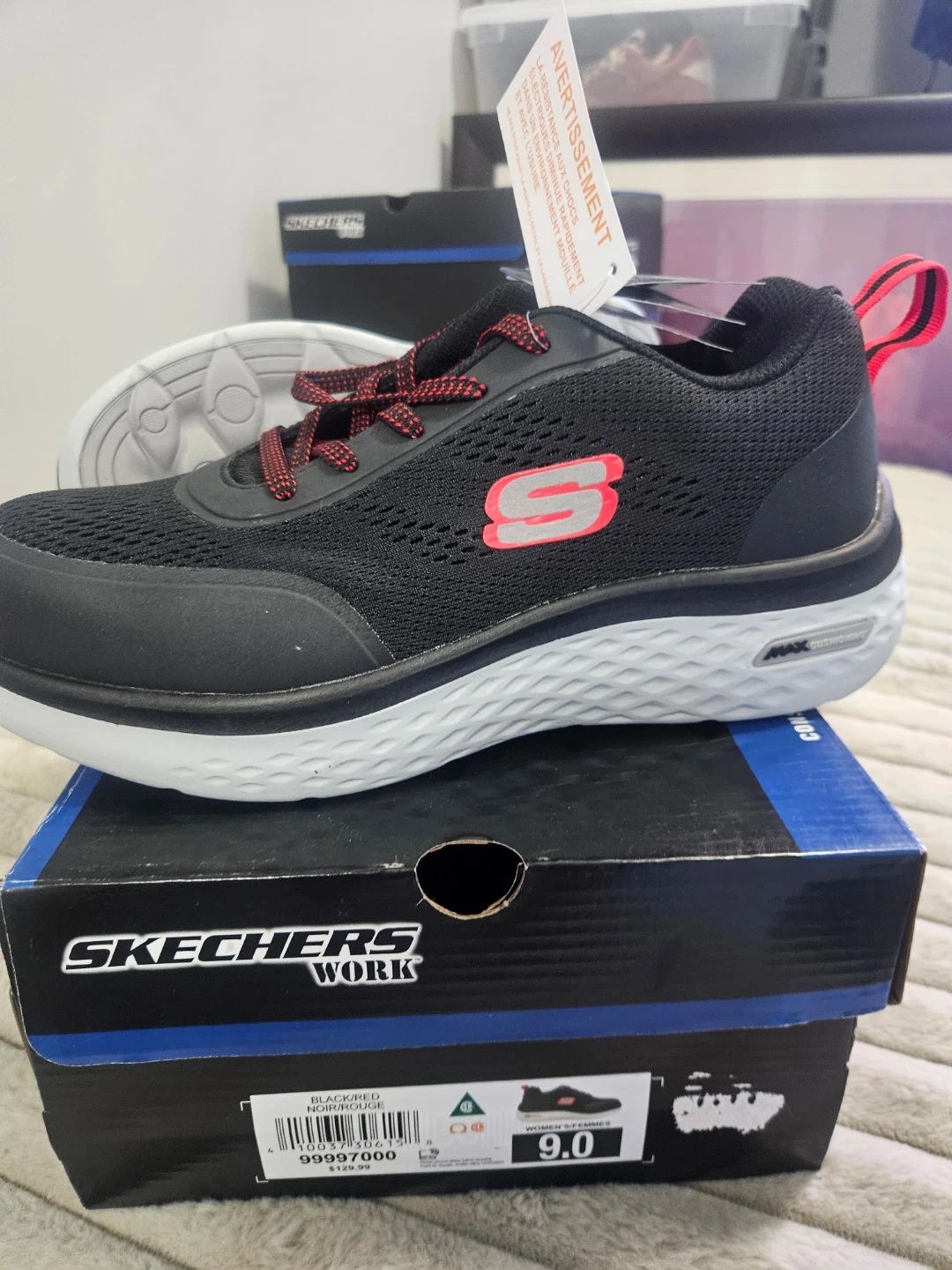 These are Skechers Work men's shoes in black and red. They're a size 9.0. Includes original box and tags. These shoes are designed for work environments.