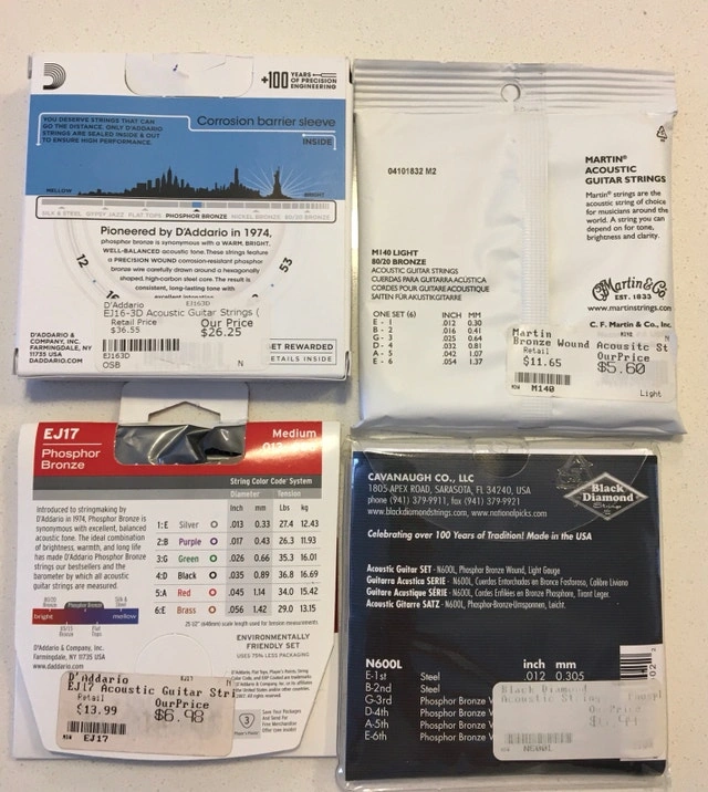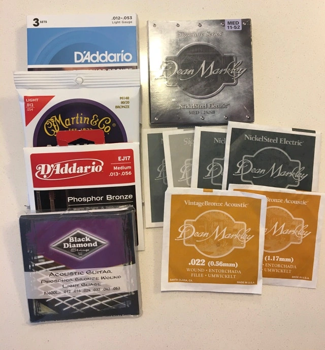 Hi there! I'm selling a large lot of brand new guitar strings, perfect for both acoustic and electric guitars. This includes 6 sets of acoustic strings, 1 set of electric strings, and several spares. They retail for about $60! You'll find a variety of gauges and brands like D'Addario, Martin & Co., Dean Markley, and Black Diamond. This is a great way to stock up and keep your guitars sounding their best. The specific sets included are: D'Addario: EJ16-3D, EJ17; Martin & Co: M140; Dean Markley: NickelSteel Electric MED 2505B, Vintage Bronze Acoustic; Black Diamond: Acoustic Guitar, Phosphor Bronze Wound Light Gauge. The ad is still up, so it's available. Thanks!