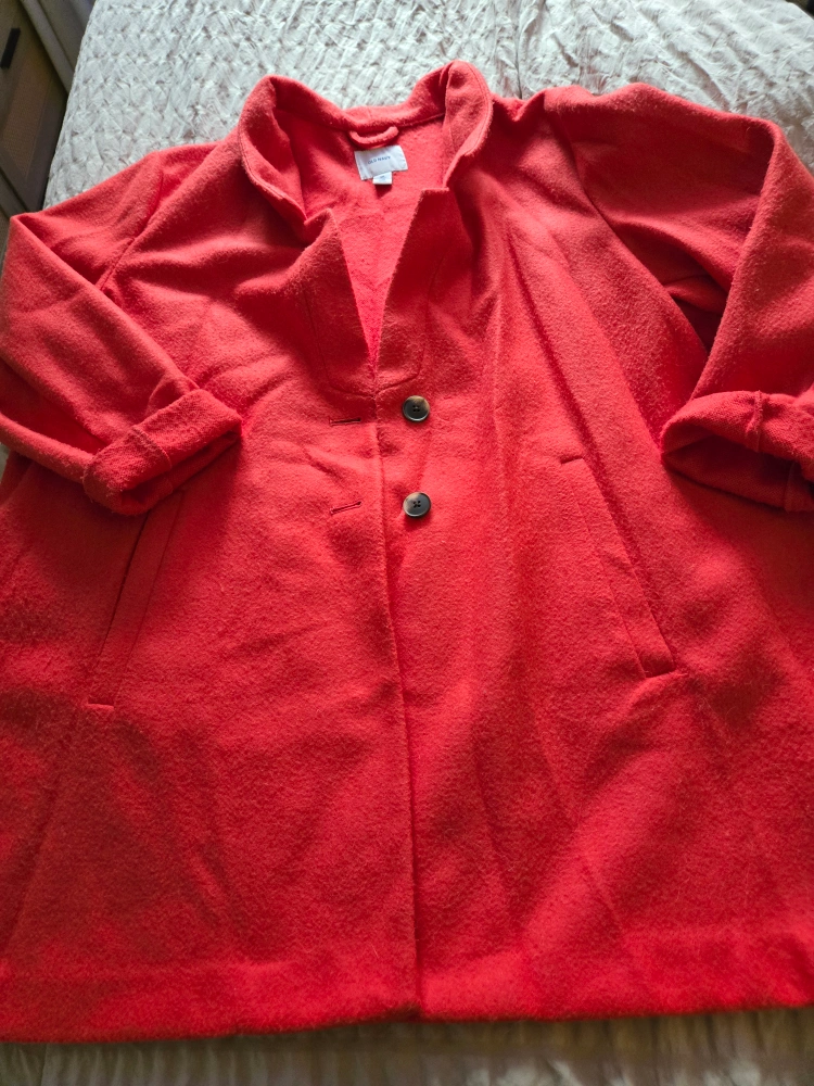 Red blazer jacket with two pockets and a button closure. Has a relaxed fit. Isvery soft and warm. Worn maybe 3x's. Dress it up or with a sweater, or crop jeans, with booties