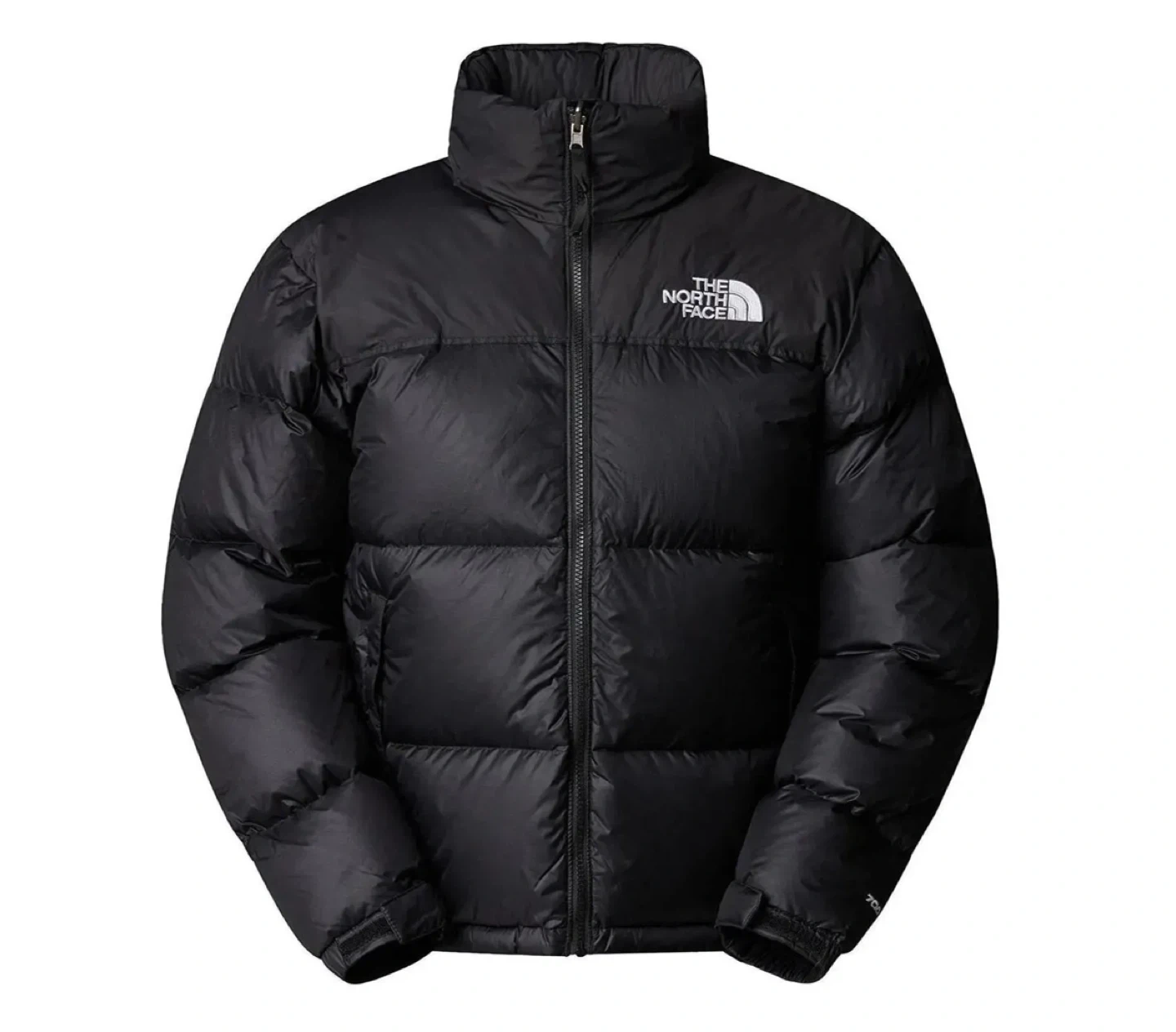 This is a black puffer jacket from The North Face. It features a high collar and a full-zip front. The jacket is insulated for warmth. It's a classic style for staying cozy in the cold!