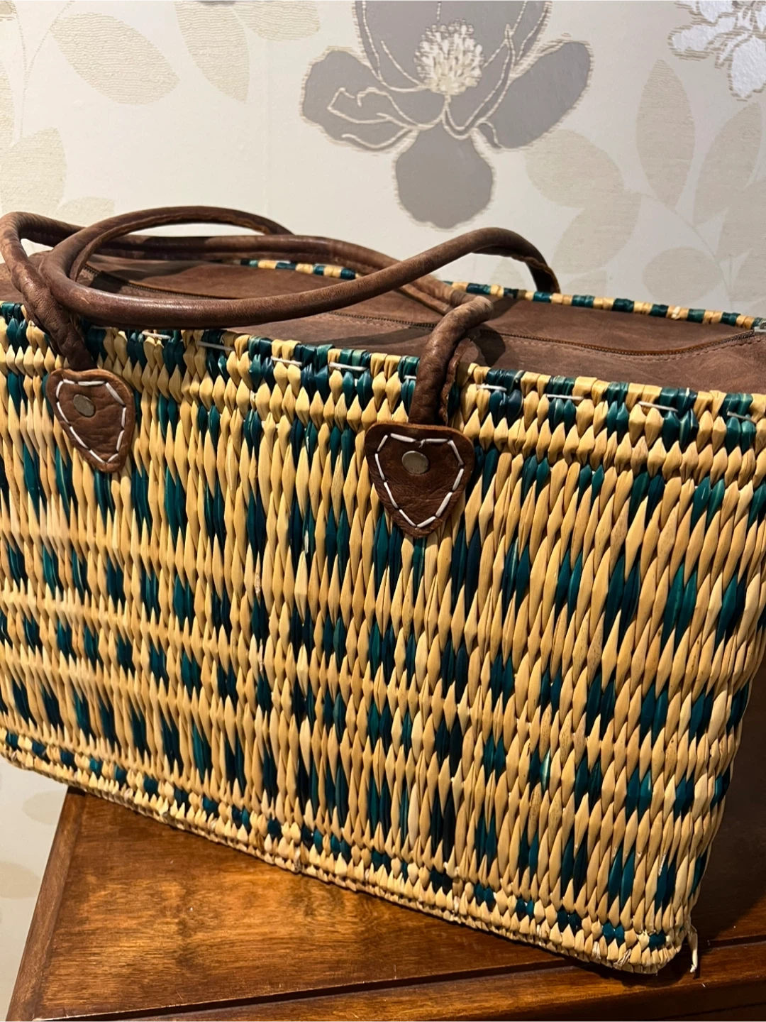 Stylish woven tote bag with brown leather handles and trim. It features a secure zipper closure. This bag is great for day trips or as a beach accessory!