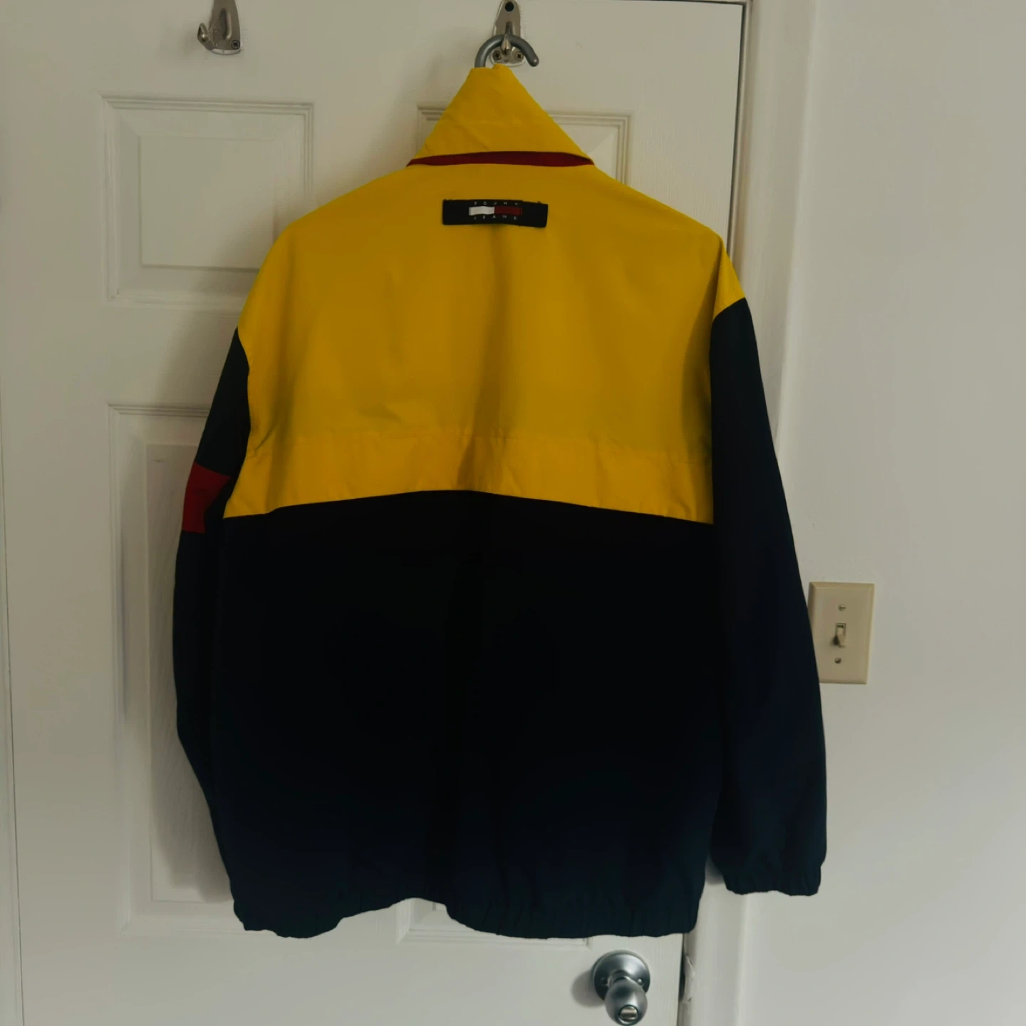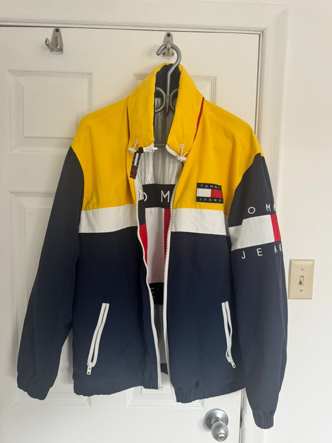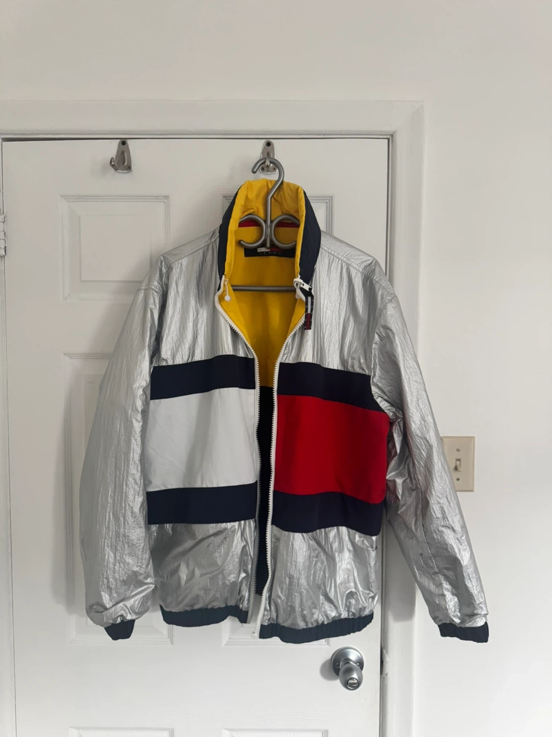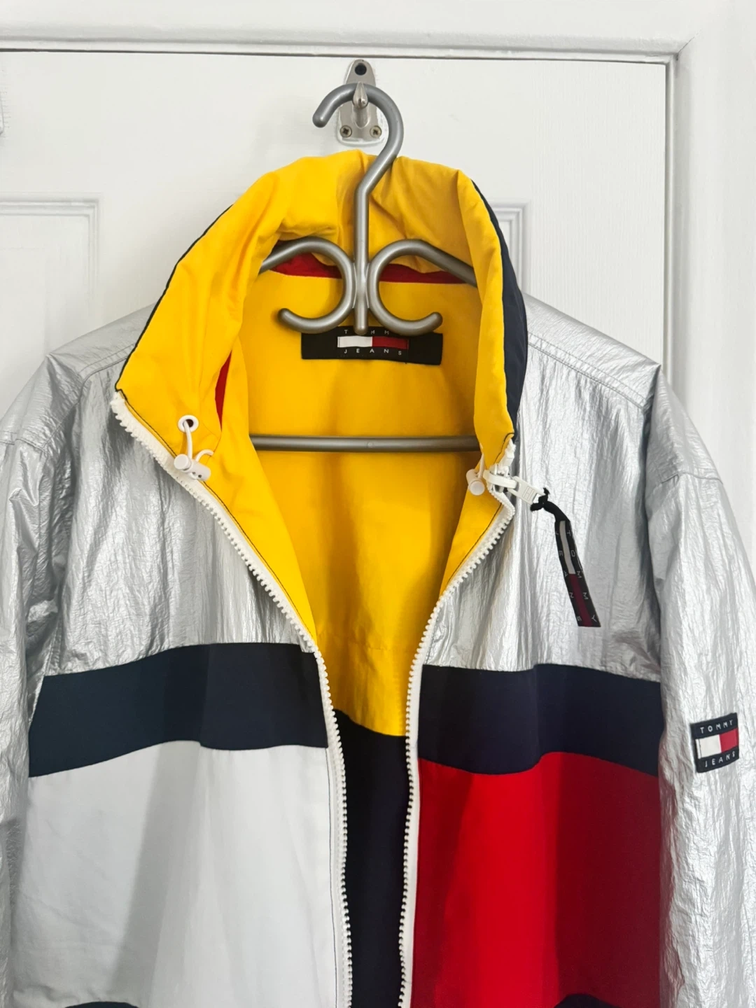 This is a Tommy Hilfiger reversible jacket. One side is silver with the iconic Tommy flag logo. The other side features a colour-block design with yellow, navy, and red. It's a great statement piece!