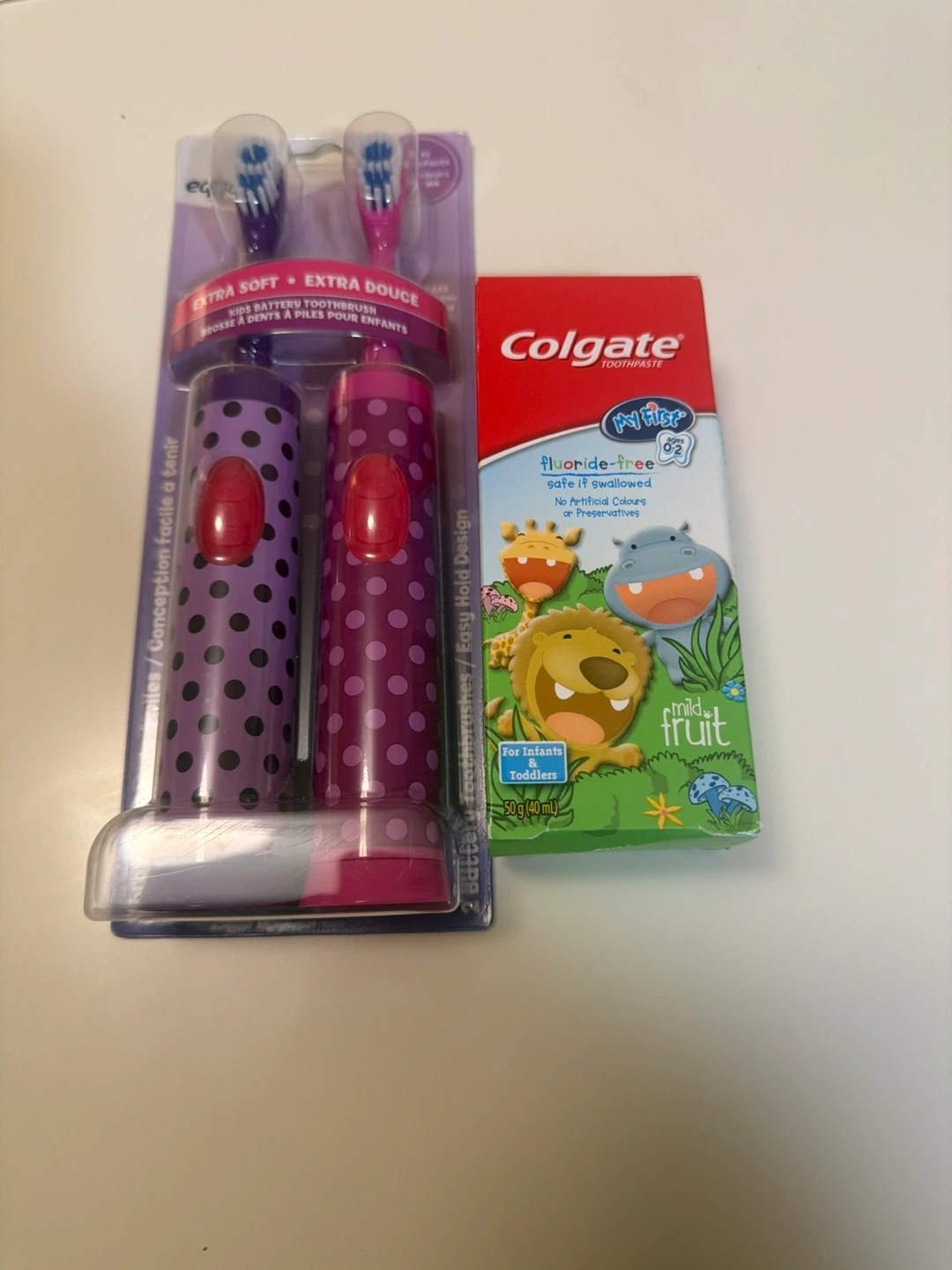 This is a set featuring an Extra Soft battery-powered toothbrush and a tube of Colgate's My First toothpaste. The toothbrush is designed with an easy hold and comes in a pack with two brushes. The toothpaste is fluoride-free, sugar-free, and has no artificial sweeteners or preservatives, in a fun mid-fruit flavour. It's suitable for infants and toddlers.