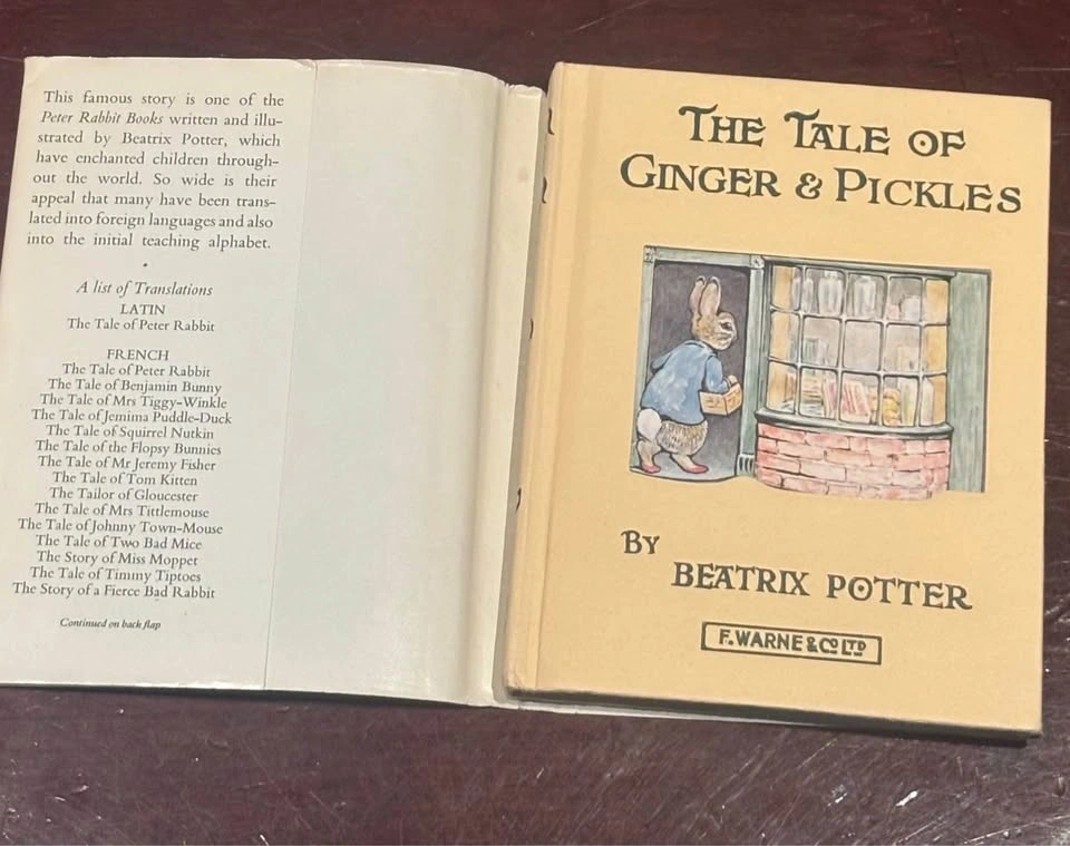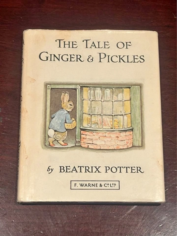A vintage hardcover edition of the children's book The Tale of Ginger & Pickles, written and illustrated by Beatrix Potter and published by Frederick Warne & Co. Let me know if you're interested!