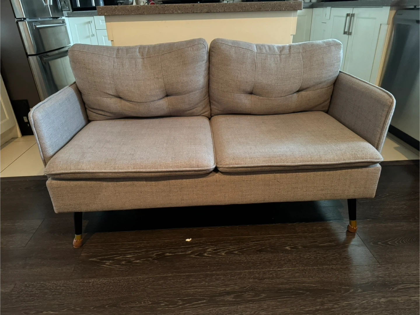 Grey fabric loveseat sofa with tufted back cushions. It features a modern design with black tapered legs. Comfortable for two people. HOMCOM 55" Loveseat Sofa, Linen Upholstered Love Seat with S Spring, Steel Legs and Button Tufting,