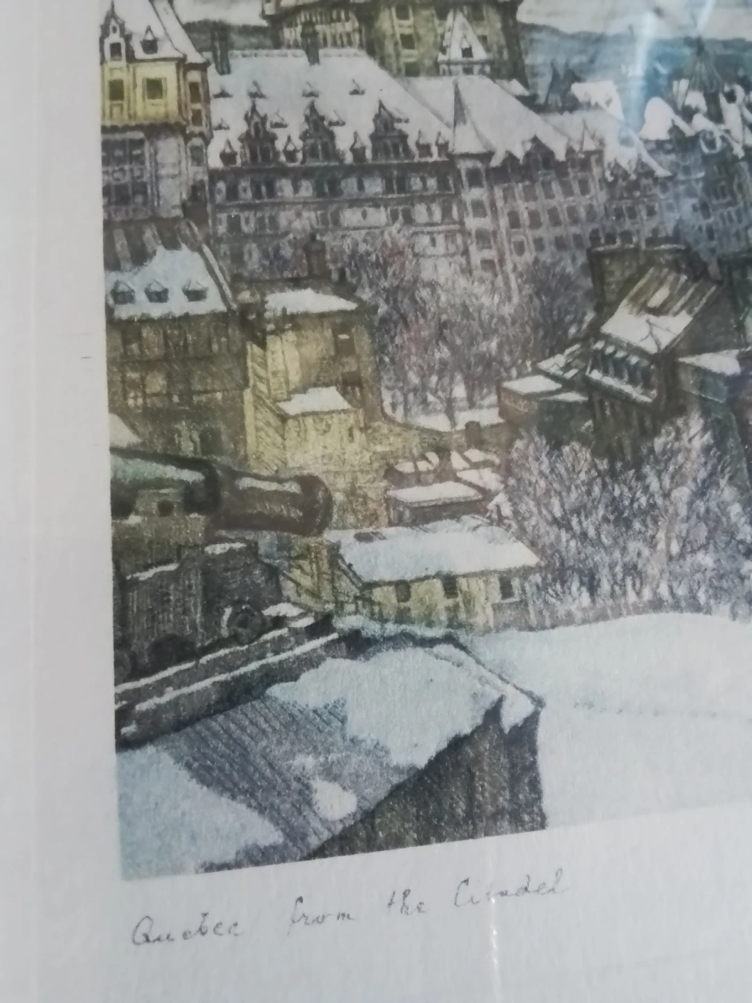This Aquantite depicts Quebec City in winter, showing the iconic Fairmont Le Château Frontenac. The artwork is signed by the artist. It's a lovely piece for any art collector or someone who appreciates Canadian landscapes.