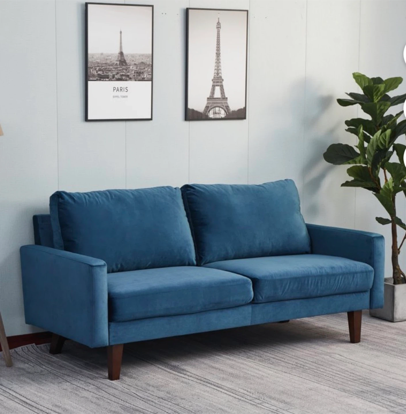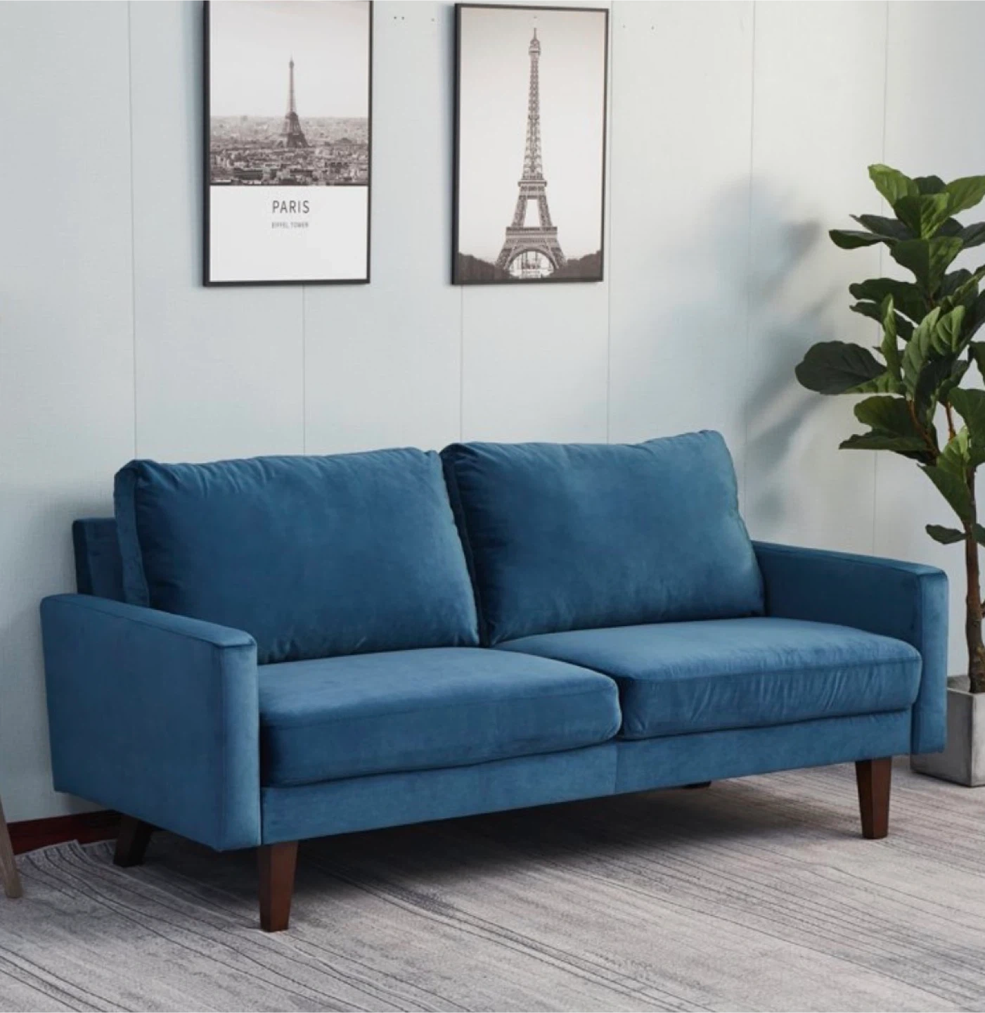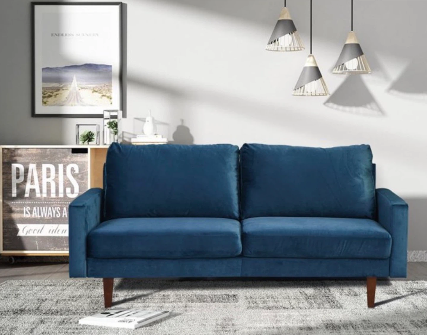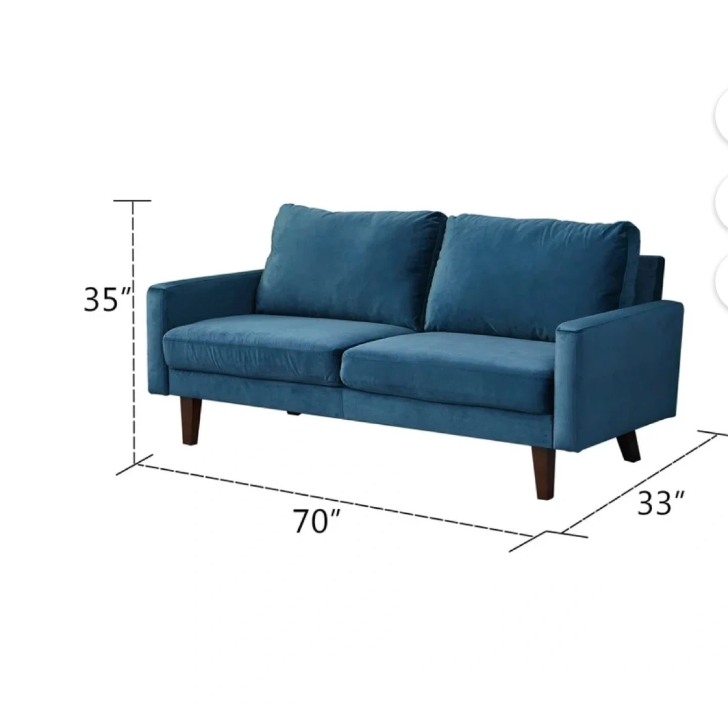 A stylish blue velvet loveseat sofa. It's 70" wide, 33" deep, and 35" high. The sofa features plush cushions and a modern design.
