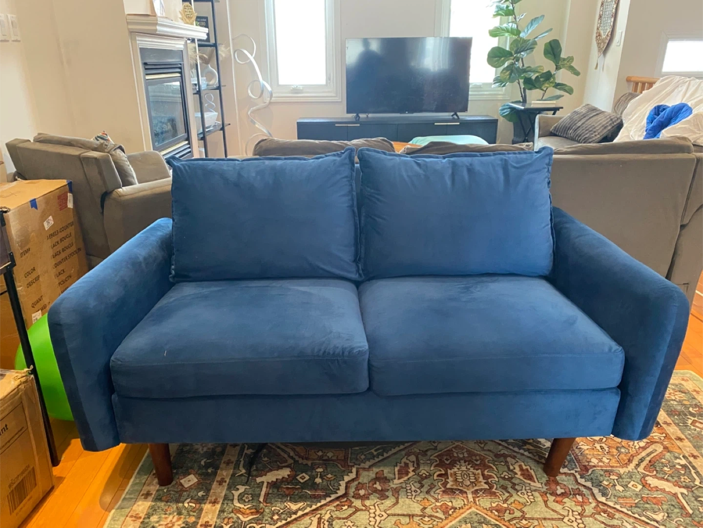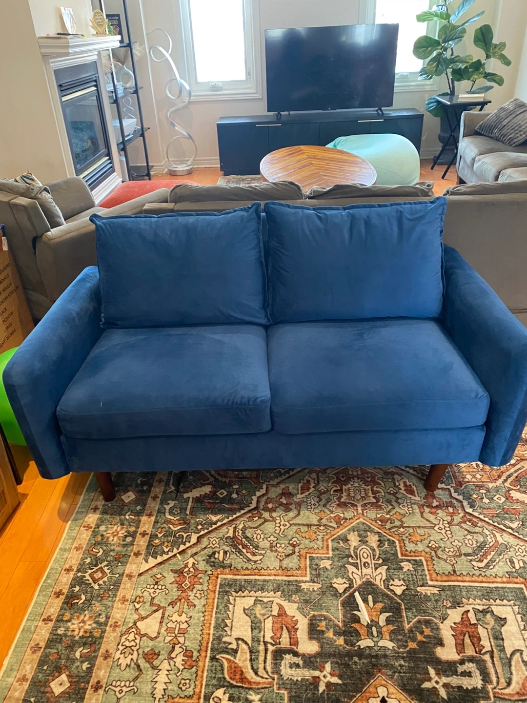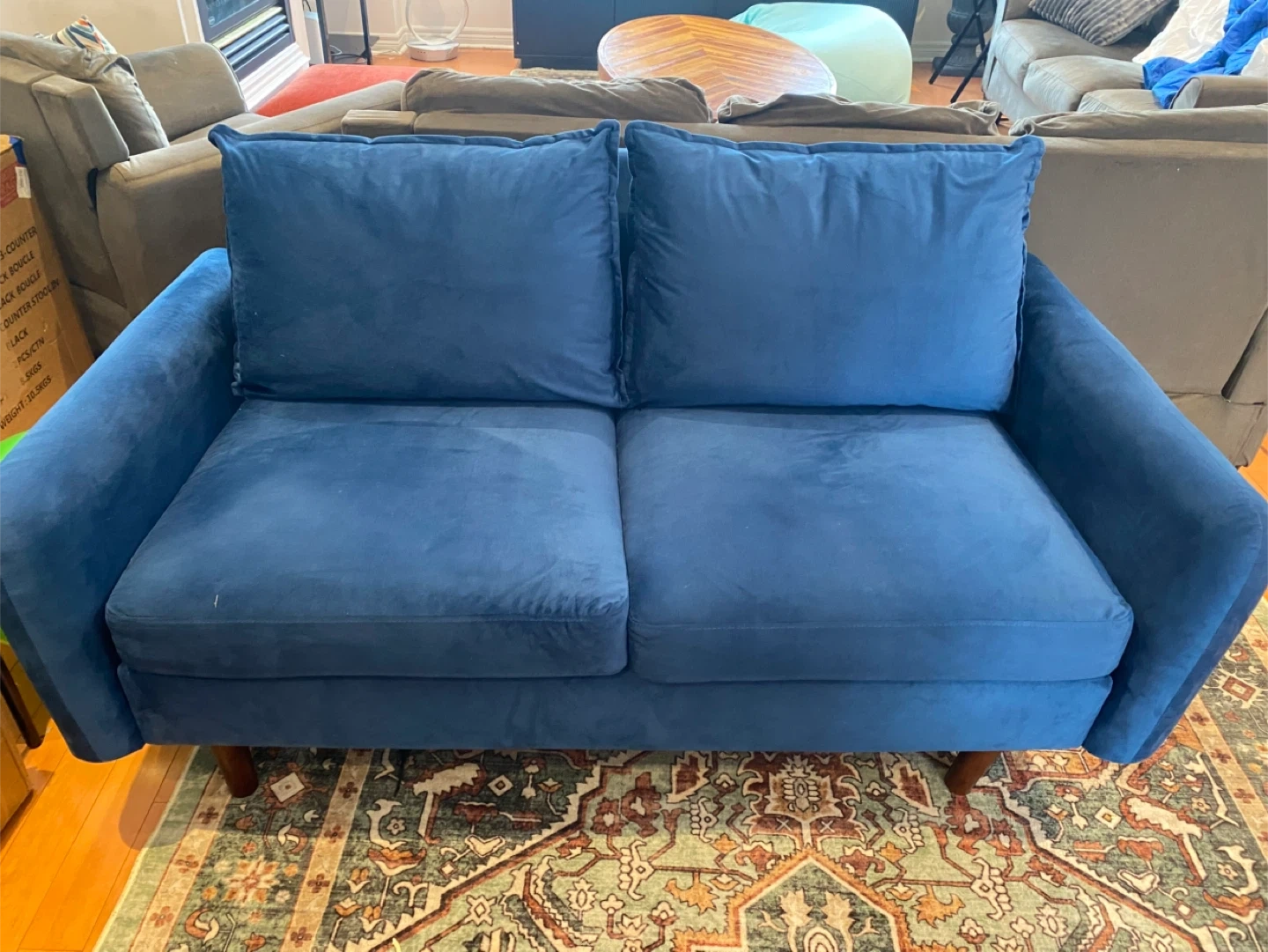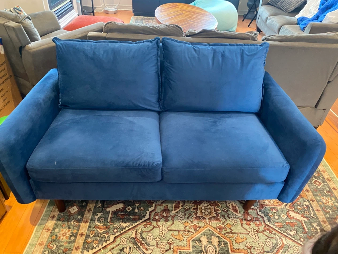 A stylish blue velvet loveseat sofa. It's 70" wide, 33" deep, and 35" high. The sofa features plush cushions and a modern design.