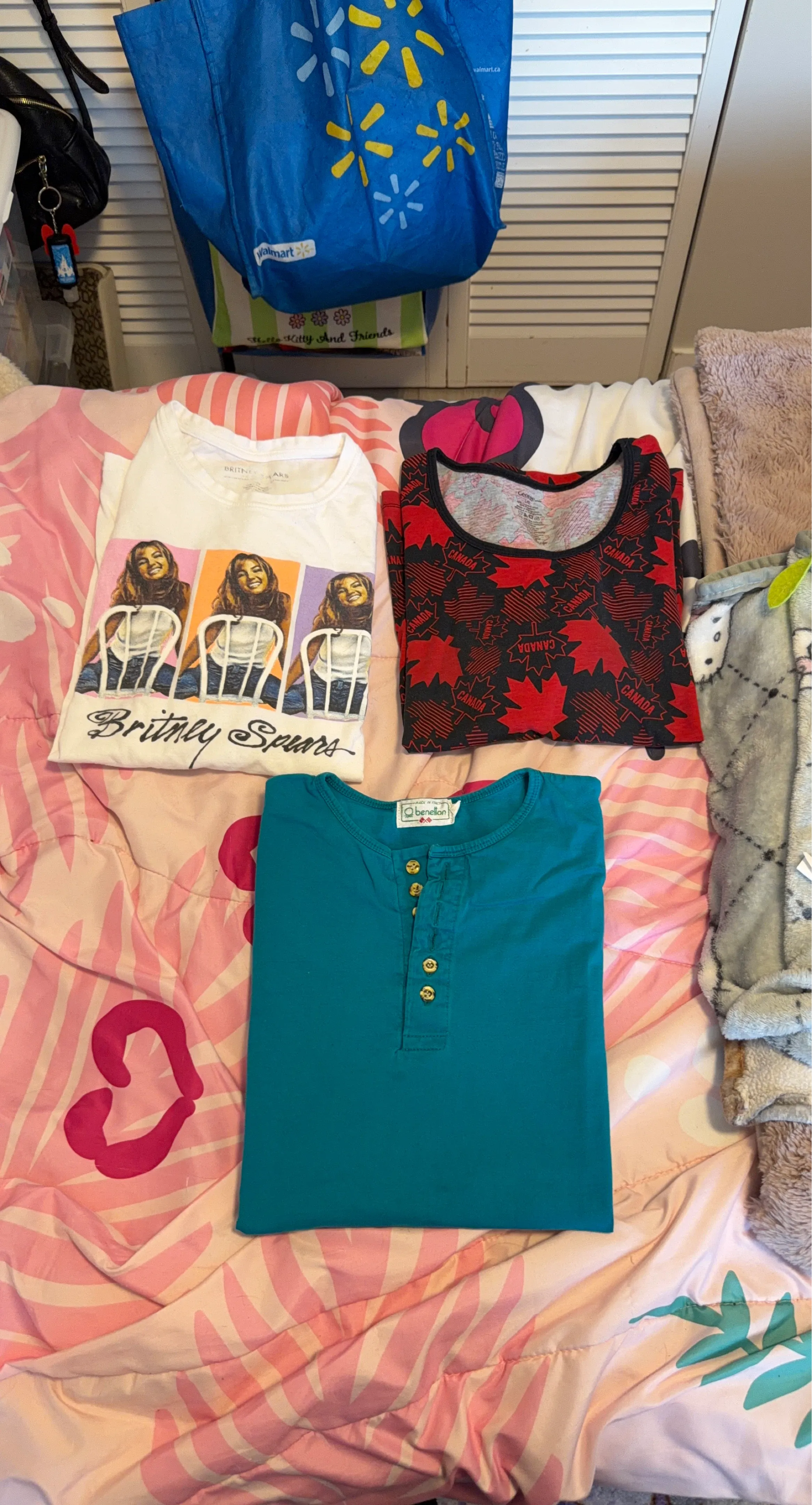 This lot includes a white Britney Spears graphic t-shirt and a red and black Canadian maple leaf tank top. Both are t-shirts made of fabric. The Britney Spears shirt has a colourful graphic of her and her name in script. The tank top has a repeating pattern of maple leaves with 'CANADA' text.