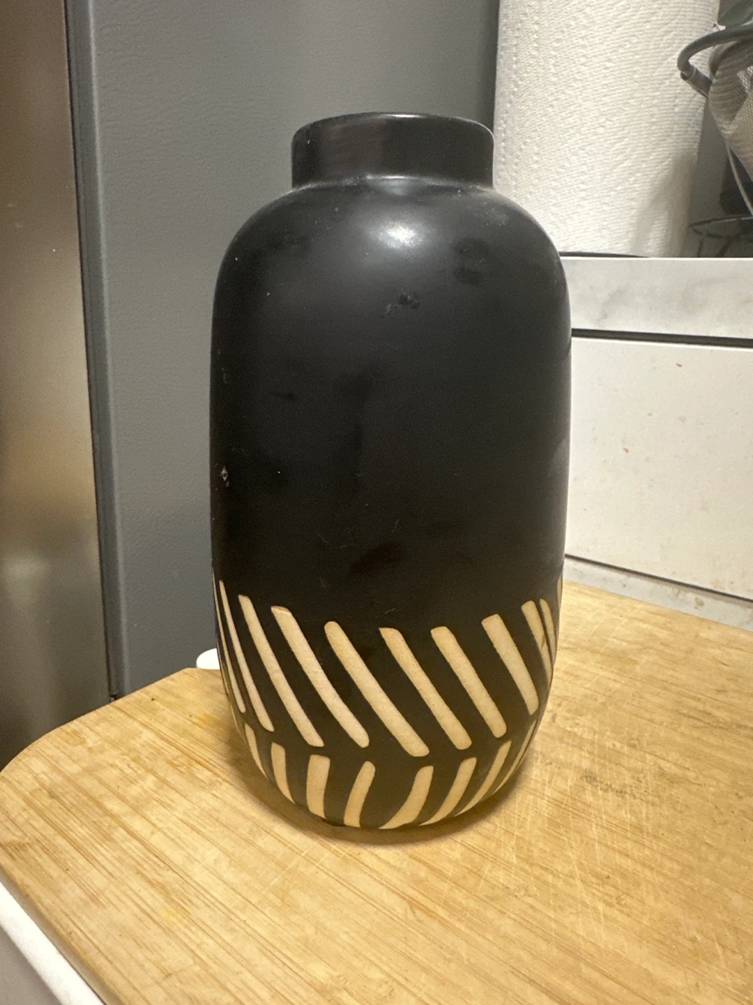 Decorative vase with a black finish and a natural wood tone base featuring a geometric pattern. It's a nice accent piece for any shelf or table. Ceramic material.