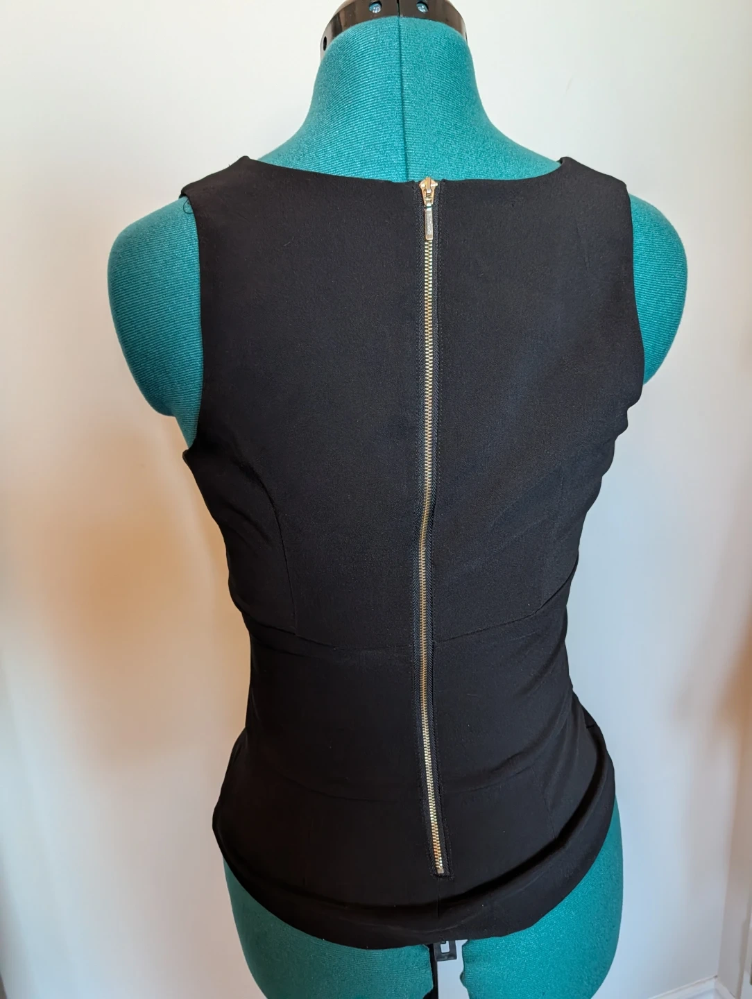This Dynamite sleeveless V-neck top is black. It features a lace-up detail on the front and a zippered closure. The material is a polyester blend. It's a size S with some stretch.