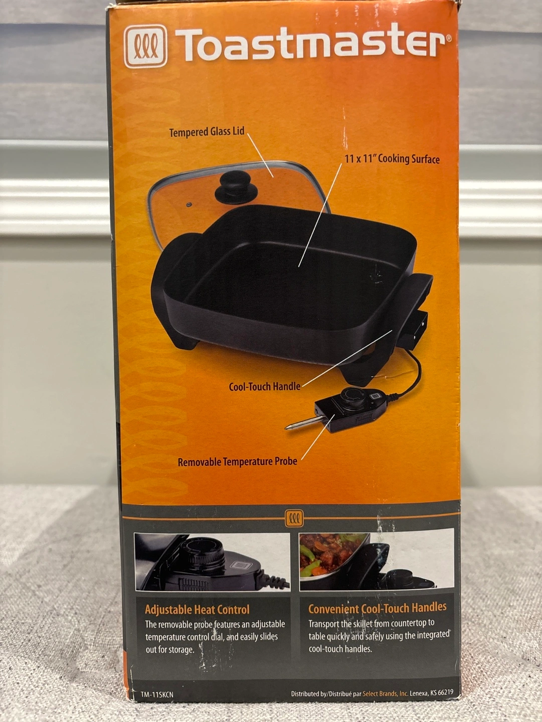 18Large nonstick surface, adjustable heat control, removable probe, cool touch side handles, tempered glass lid.