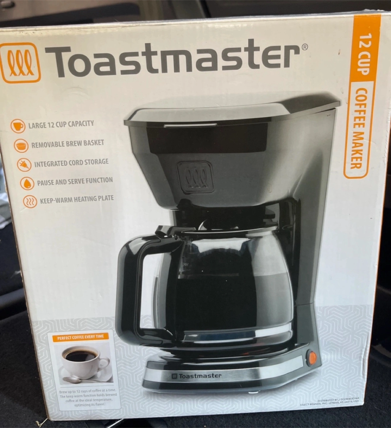 Selling a brand new Toastmaster 12-cup coffee maker, still in its original box! It features a large 12-cup capacity, removable brew basket, integrated cord storage, and a pause and serve function. It also has a keep-warm heating plate, an on/off switch with a power light, and a glass carafe. Perfect for brewing up to 12 cups of coffee at a time!