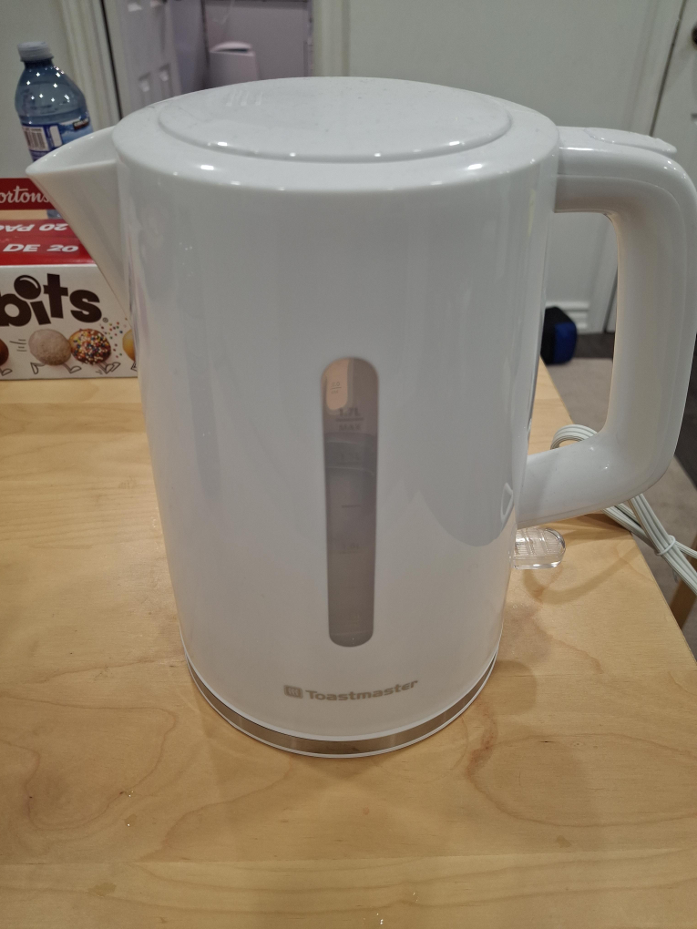 65Selling a Toastmaster electric kettle in white. It's in great shape and ready to quickly boil water for your tea or coffee! The kettle has a visible water level indicator and a sleek design that fits well in any kitchen