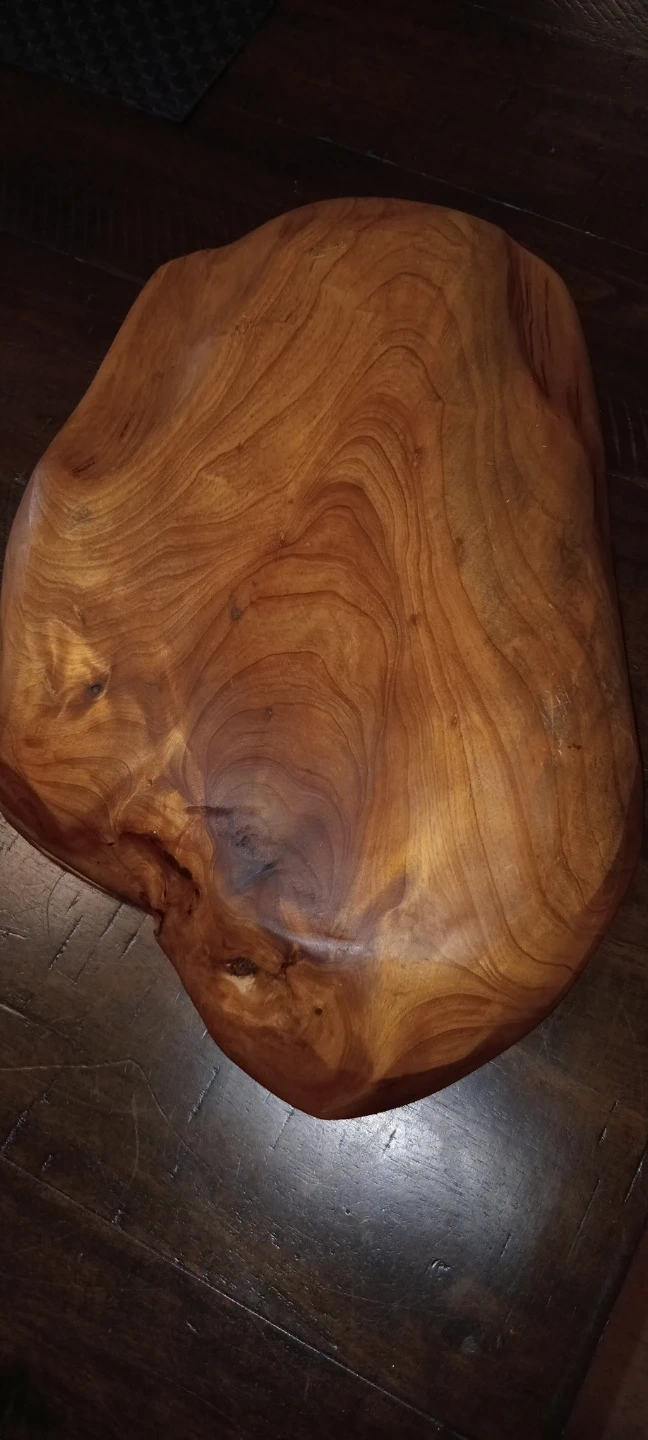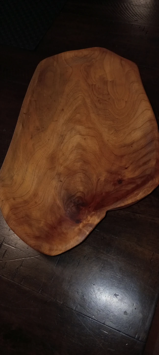 Handcrafted wooden serving board with a unique, natural shape. Made from solid wood, it showcases beautiful grain patterns. Perfect for serving appetizers or as a decorative piece on your table.