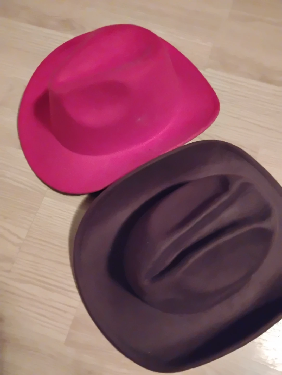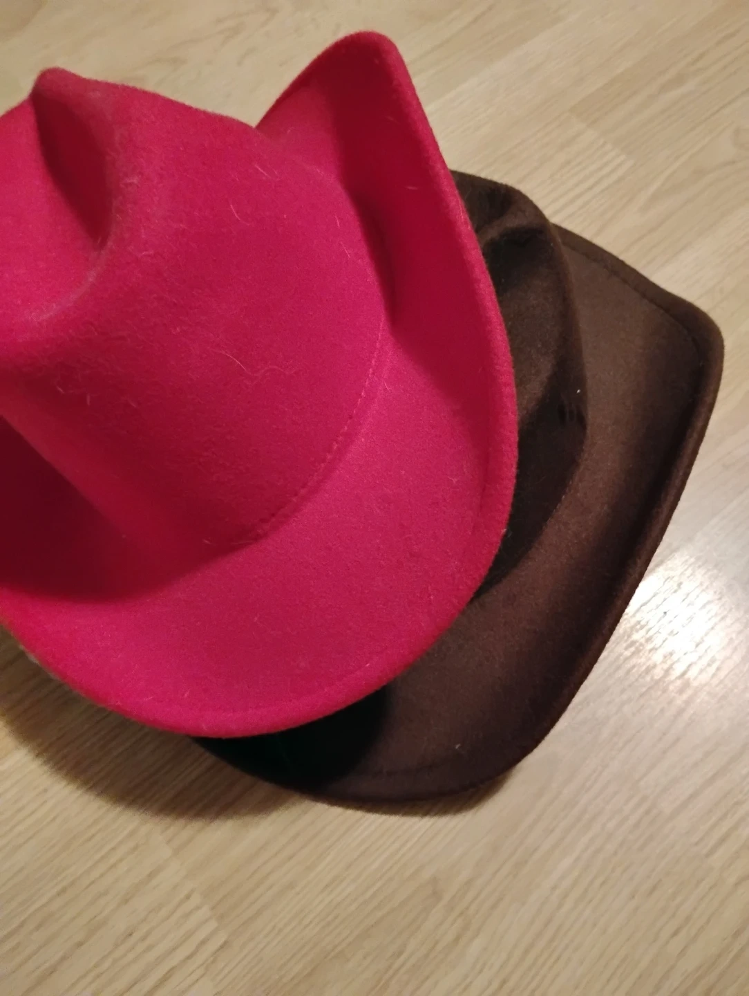 These are fun felt cowboy hats. They're made of 65% cotton and 35% polyester. Available in bright pink and brown colours. These hats are great for parties or dress-up!