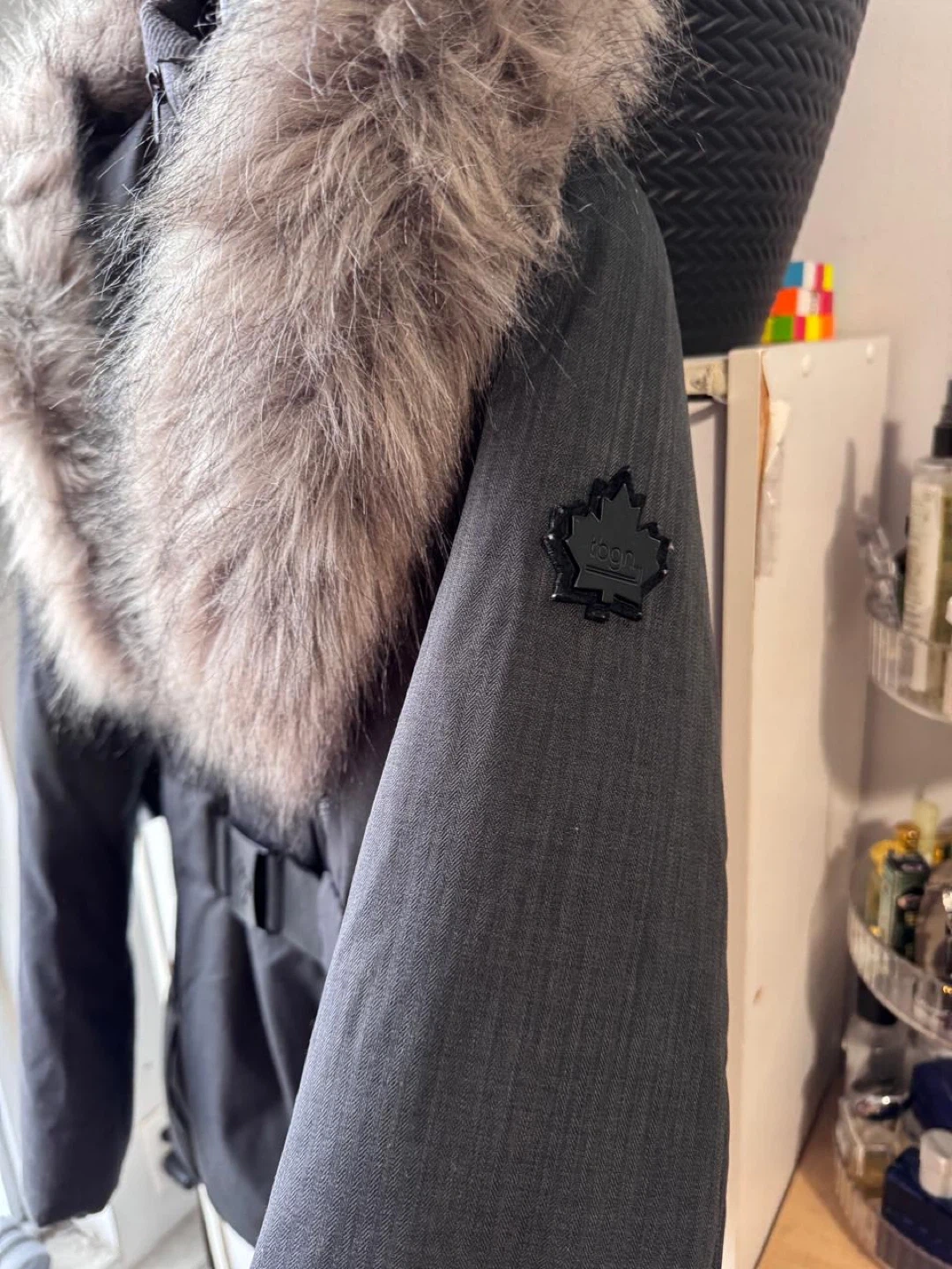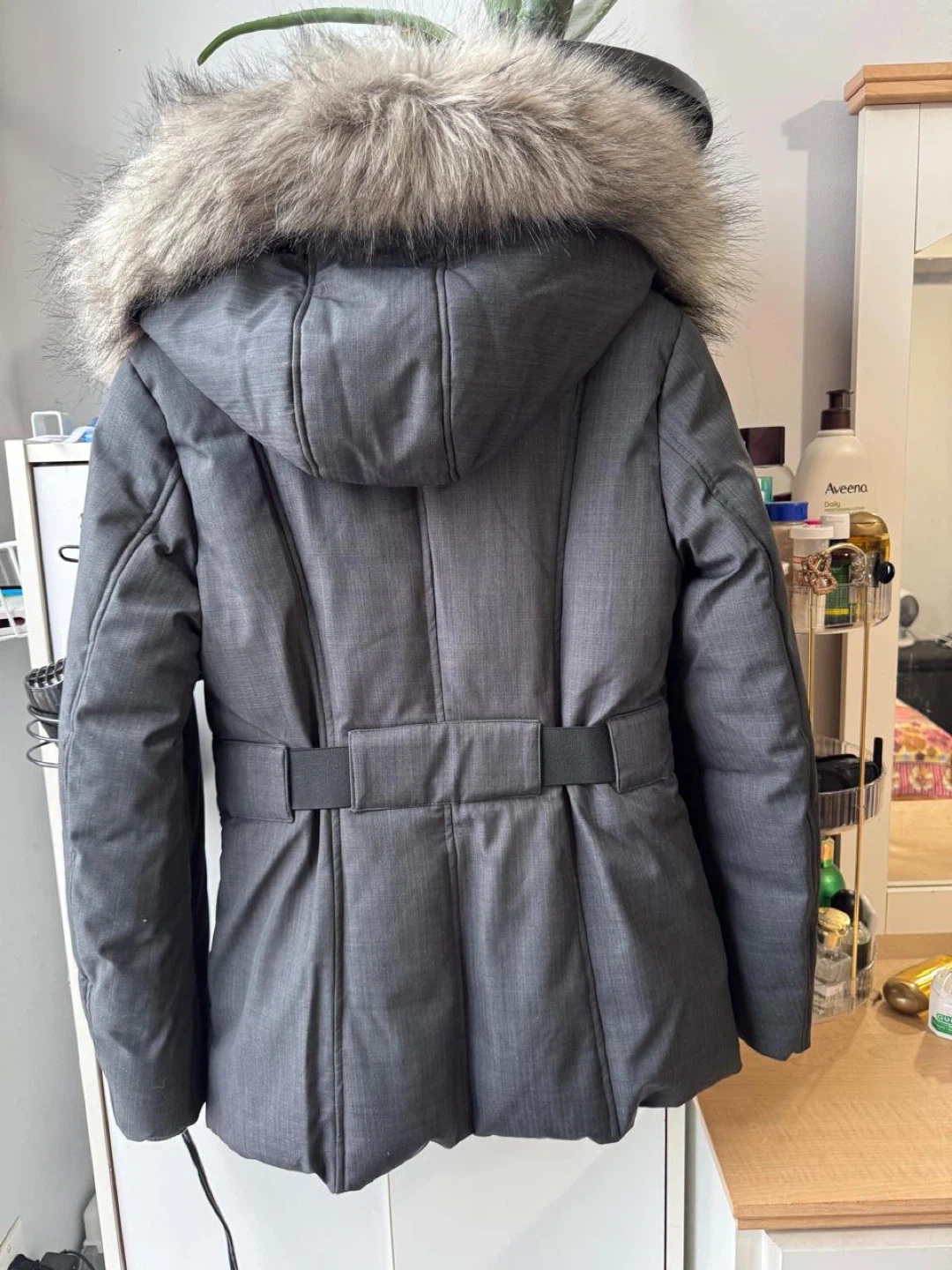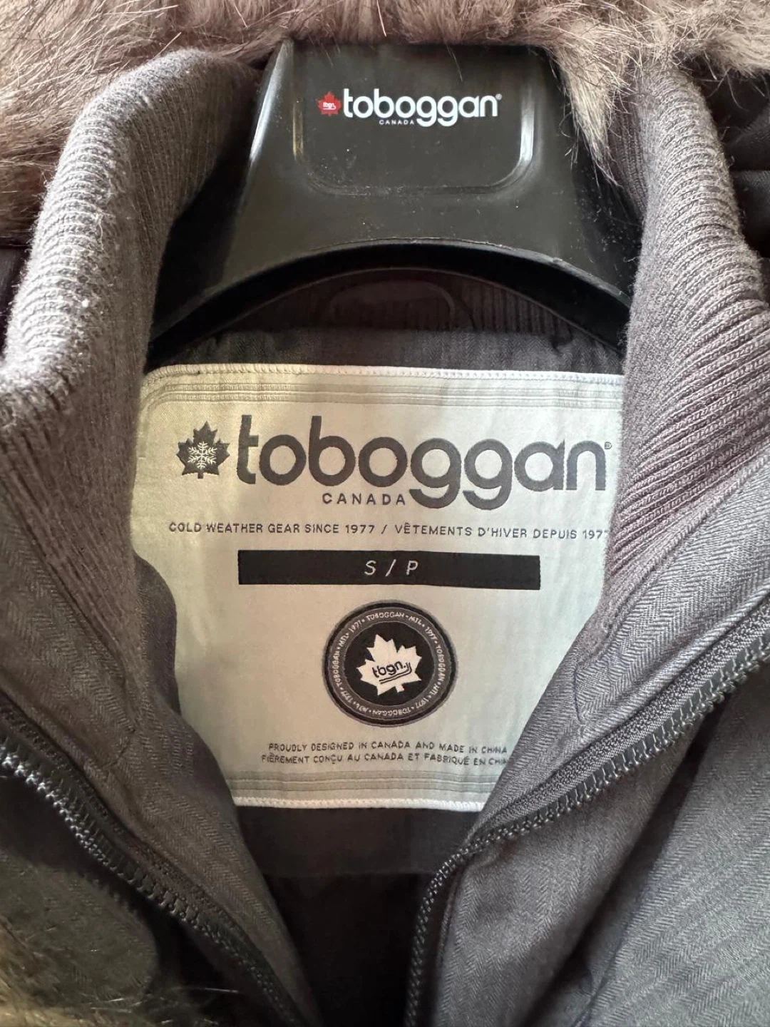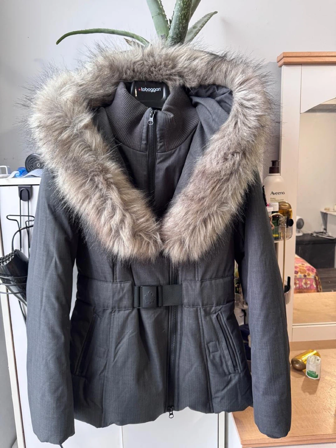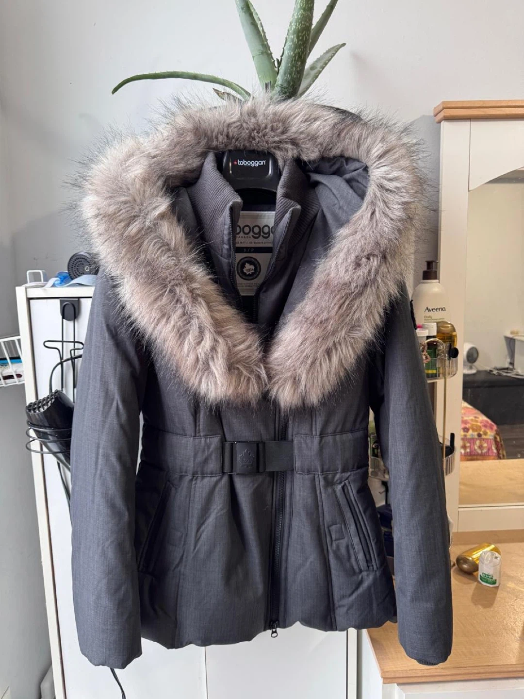 10Selling a Toboggan Canada winter jacket in size S/P! It's in great condition and perfect for the cold weather. The jacket features a stylish design with a fur-trimmed hood and a belted waist. It's a cozy and fashionable choice for staying warm this winter Used only twice, size is small for me