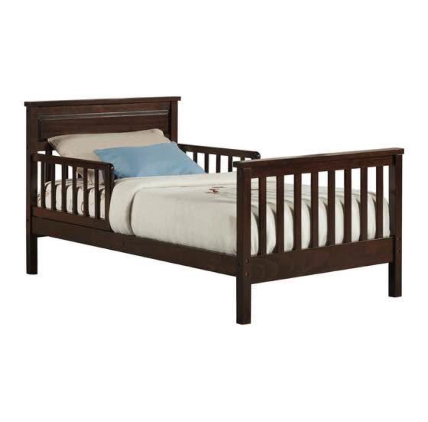Here's a toddler bed in a dark wood finish! It's in great shape and ready for a new home. Perfect for transitioning your little one from a crib to a bed You can have the mattress for free