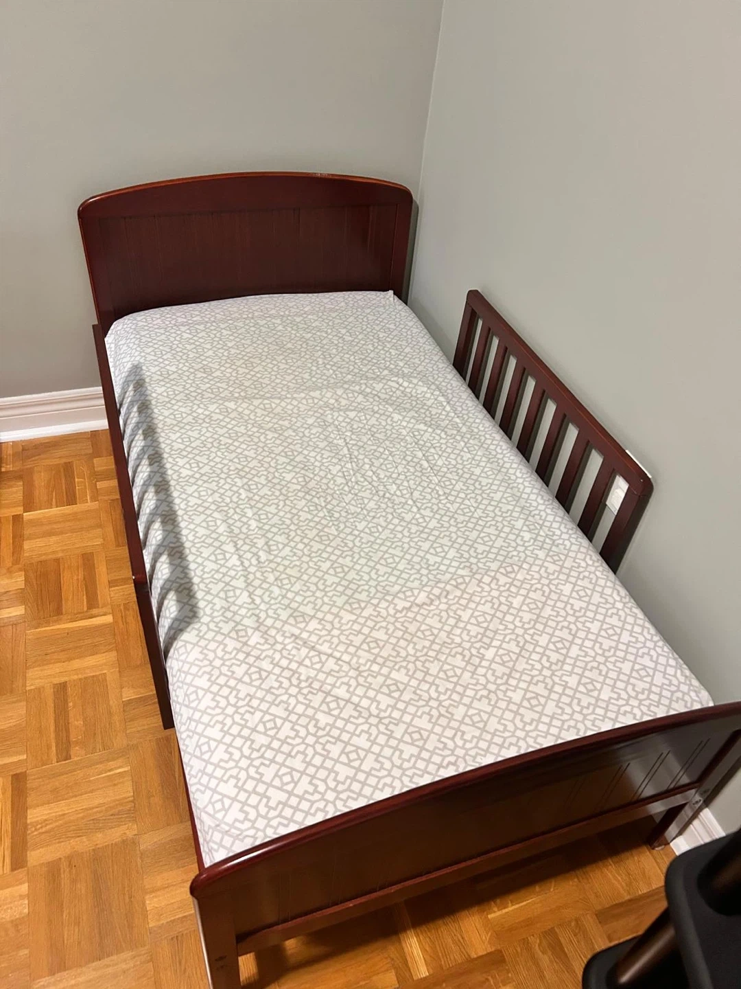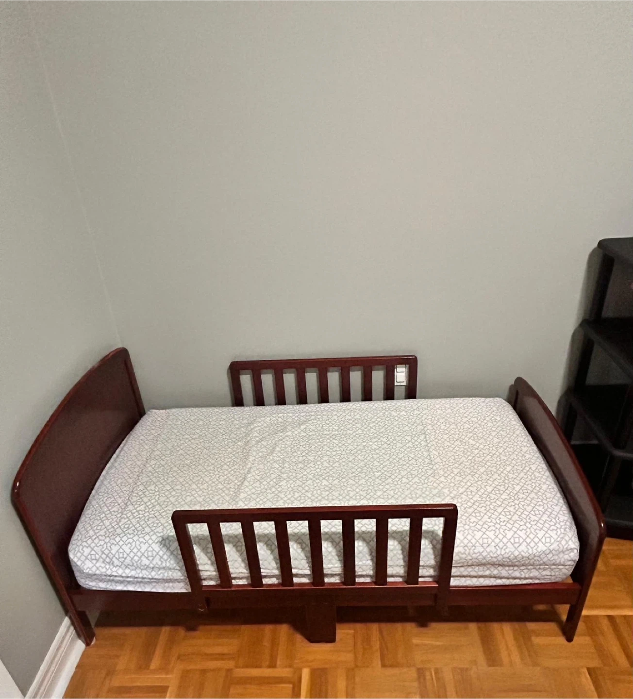 Selling a toddler bed in great condition! Perfect for transitioning your little one from a crib. It's sturdy and has safety rails to keep your child secure. The bed is a nice, warm brown colour that will fit well in any room. Mattress included!