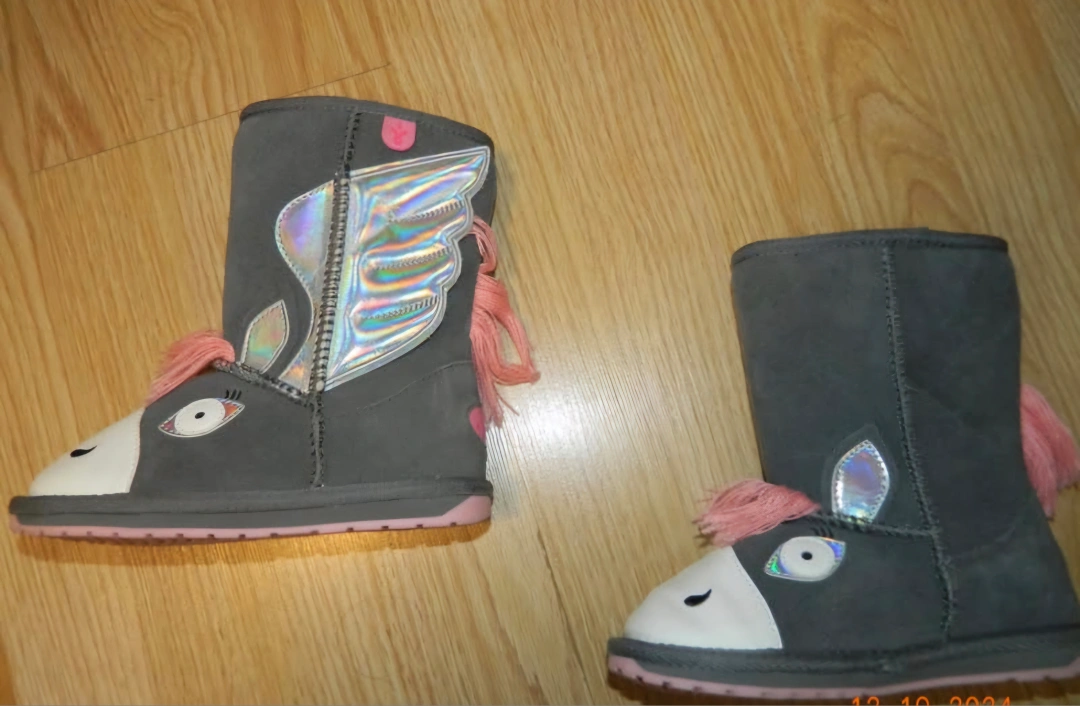These adorable Emu Australia unicorn boots are in great condition! They feature a charming unicorn design with pink accents and a grey suede-like material. LIKE NEW TODDLER GIRL EMU AUSTRALIA BOOTS..size K10..suede and super thick sherpa lining Sb 15 inc 1 Near Thornton and Gibb Auction ends fri 8:01pm