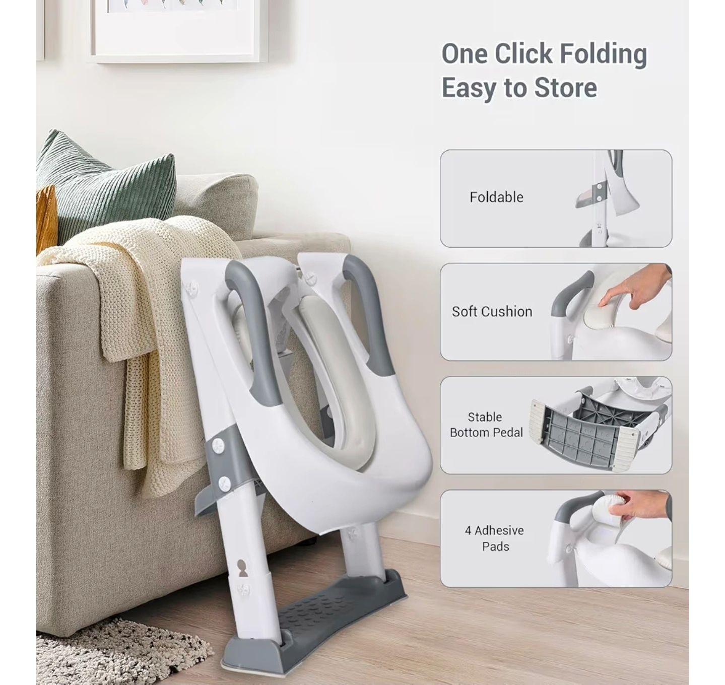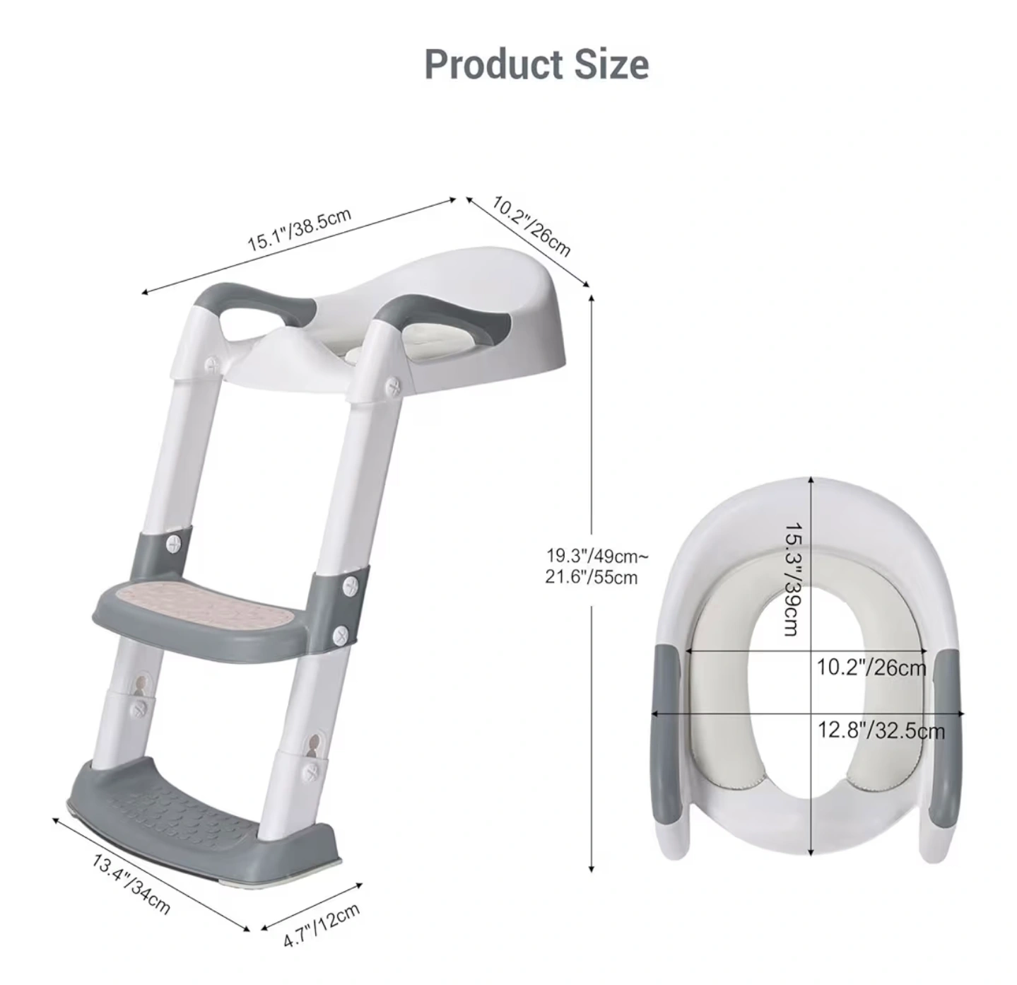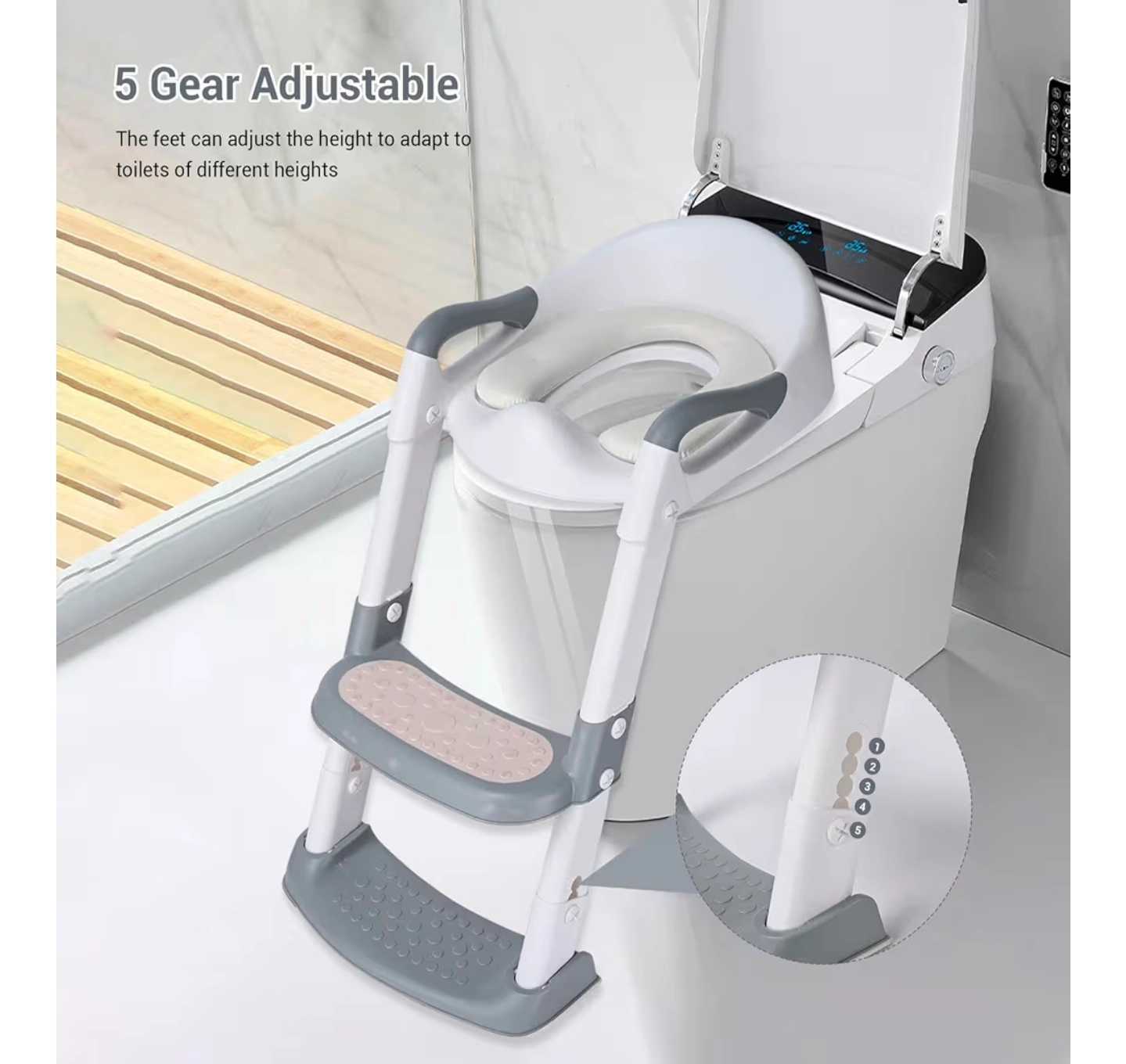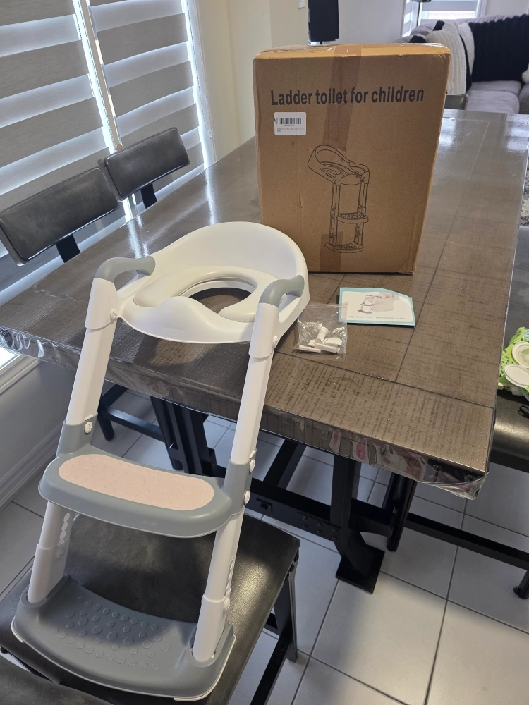 87Selling a toddler toilet ladder seat! It's designed to help your little one use the toilet safely and comfortably. Key features: - 5 gear adjustable height to fit different toilets - One-click folding for easy storage - Soft cushion for comfort - Stable bottom pedal - Includes 4 adhesive pads for secure placement The product size is approximately 15.1"/38.5cm wide and the seat is 15.3"/39cm long. It new and already assembled for you.