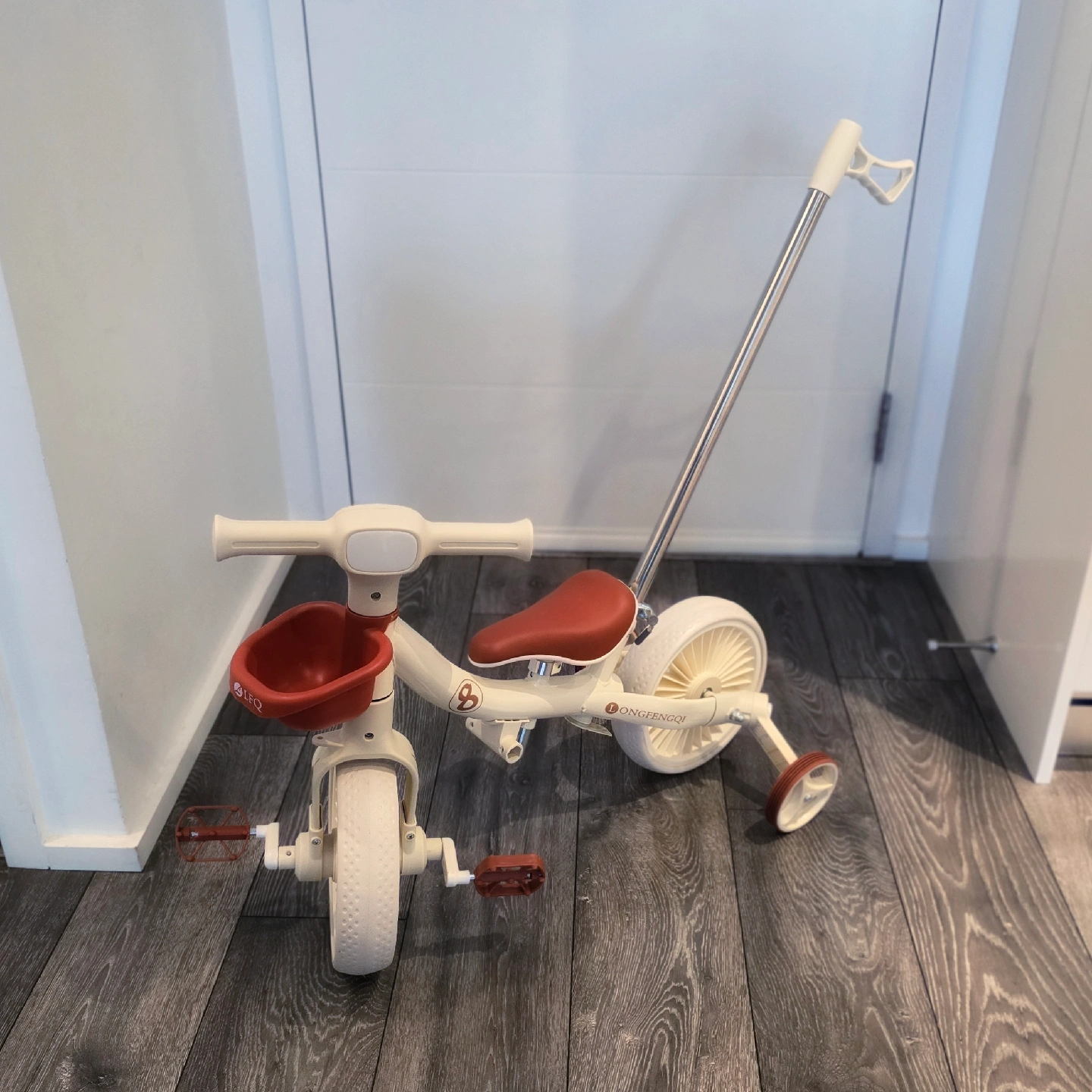 22Selling a cute tricycle! It comes with a convenient push handle for parents to help guide little ones as they learn to ride. The tricycle is in great condition and ready for a new home! Back support wheels flip up and pedals are removable.