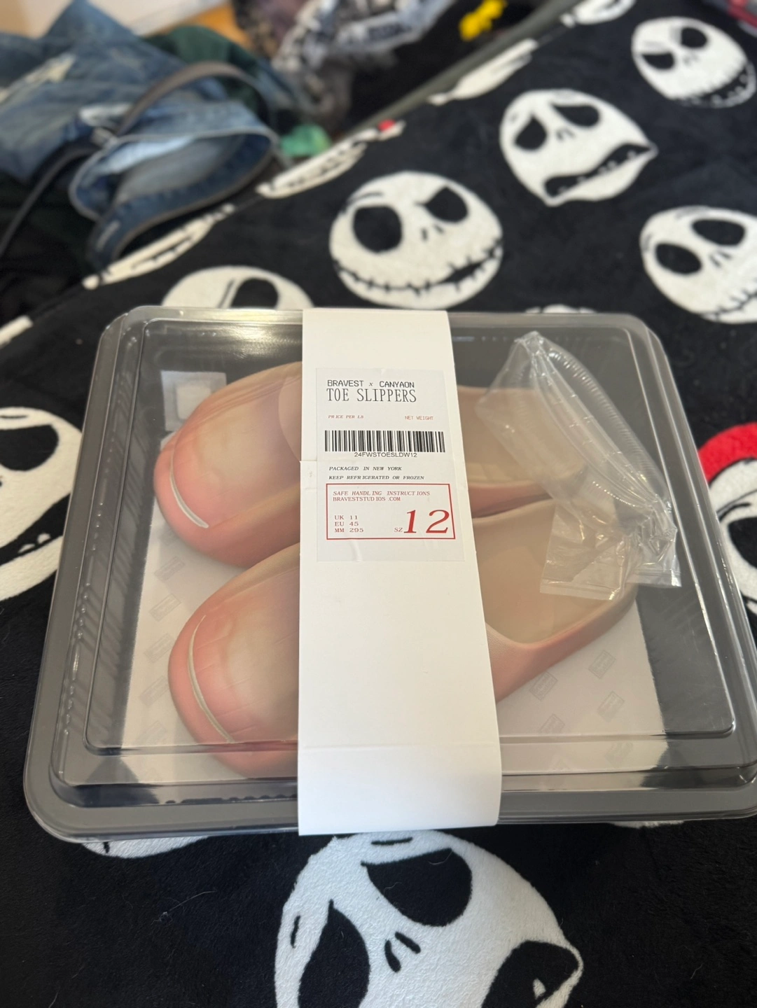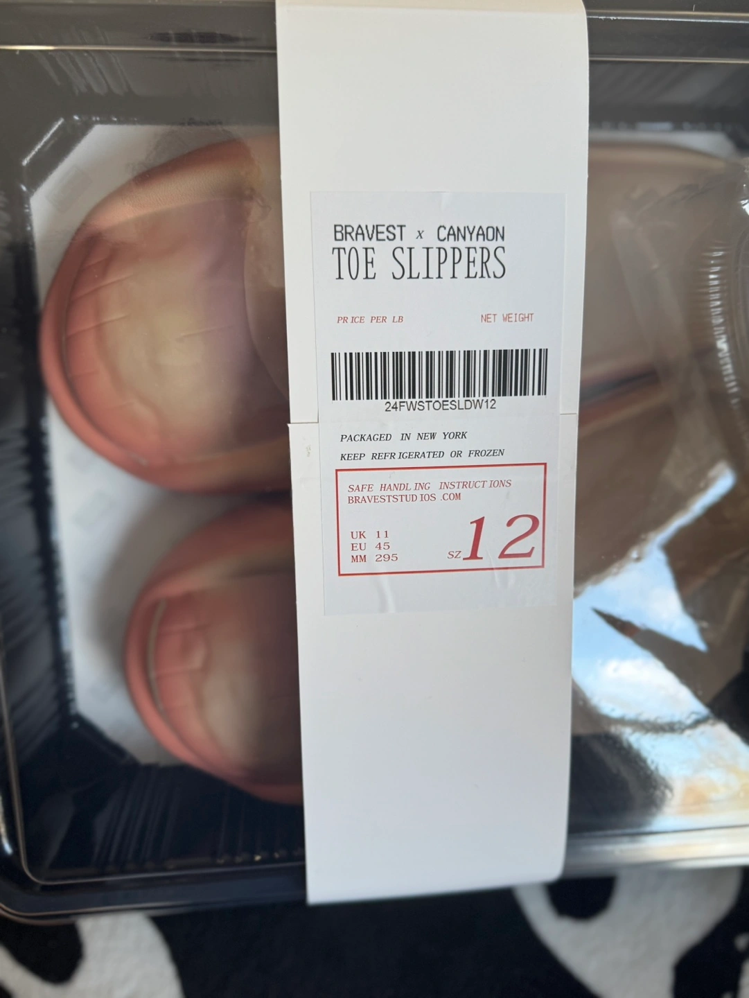New Brave Studios toe slippers collaboration with Canyon. Size 12, packaged in New York. Keep refrigerated or frozen. UK 11, EU 45, Men's 12.