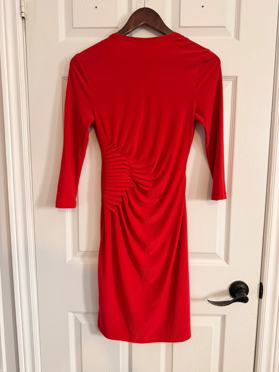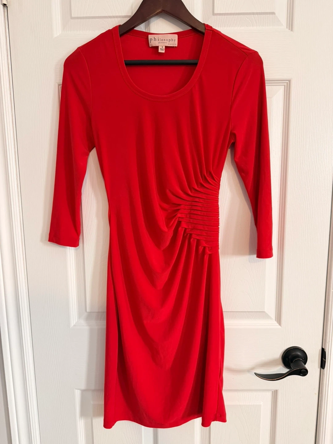 This red dress from Philosophy Dresses features a flattering ruched detail on the side. It's a size small with 3/4 sleeves and a midi length. The fabric is soft and drapes nicely.