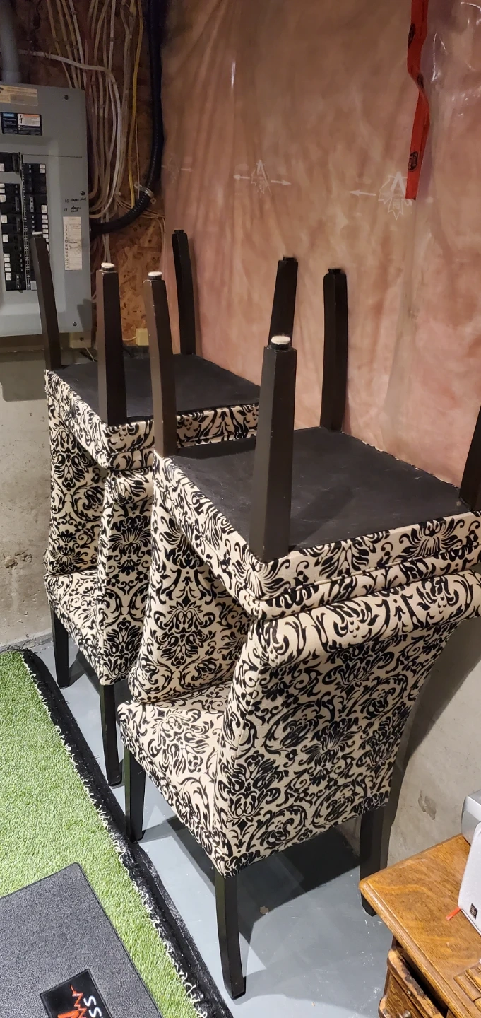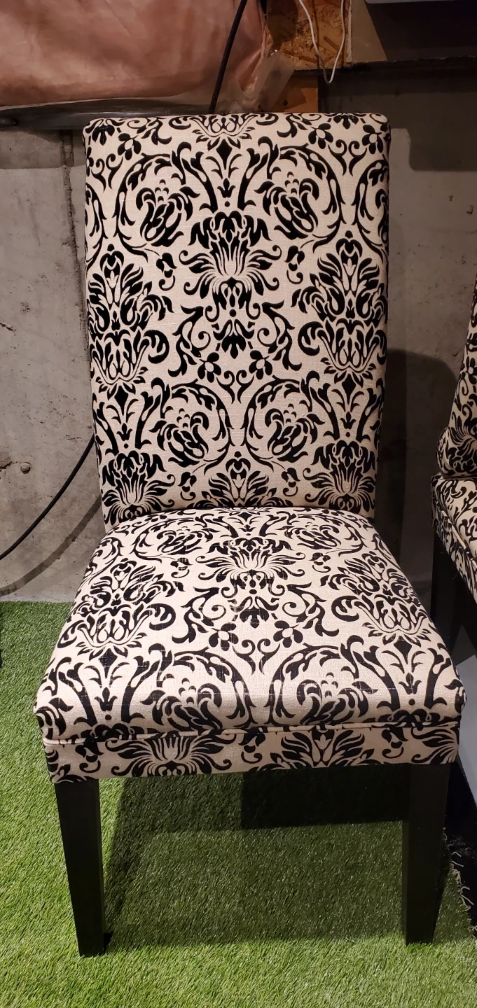 6 Stoney Creek Furniture upholstered dining chairs featuring a black and cream damask print. The chairs have dark wood legs and a high back design. They're perfect for adding a touch of elegance to your dining space.