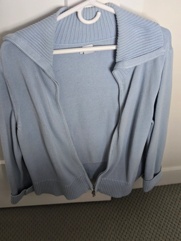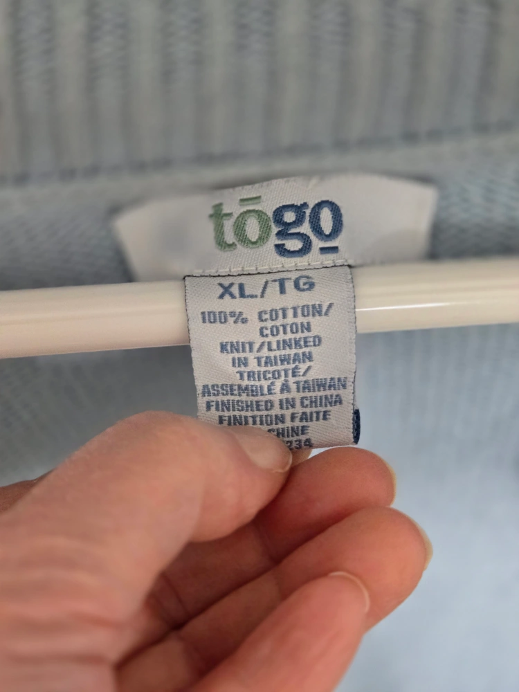 10Cozy up in this Togo knit sweater! It's a size XL and made of 100% cotton. The light blue colour is perfect for spring or fall. This zip-up sweater is in great condition and ready for a new home