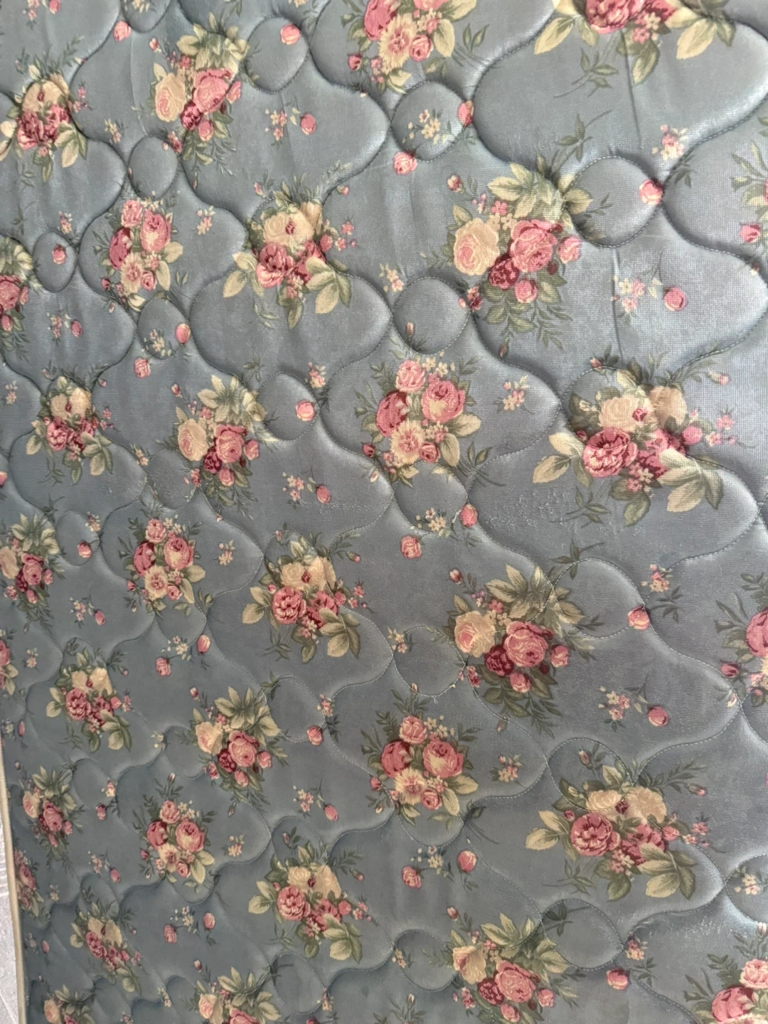 This is a mattress featuring a blue floral pattern with pink roses. It has a quilted surface and a rope trim. It is a twin-size mattress bc spring available for extra cost pickup or delivery available for extra $$