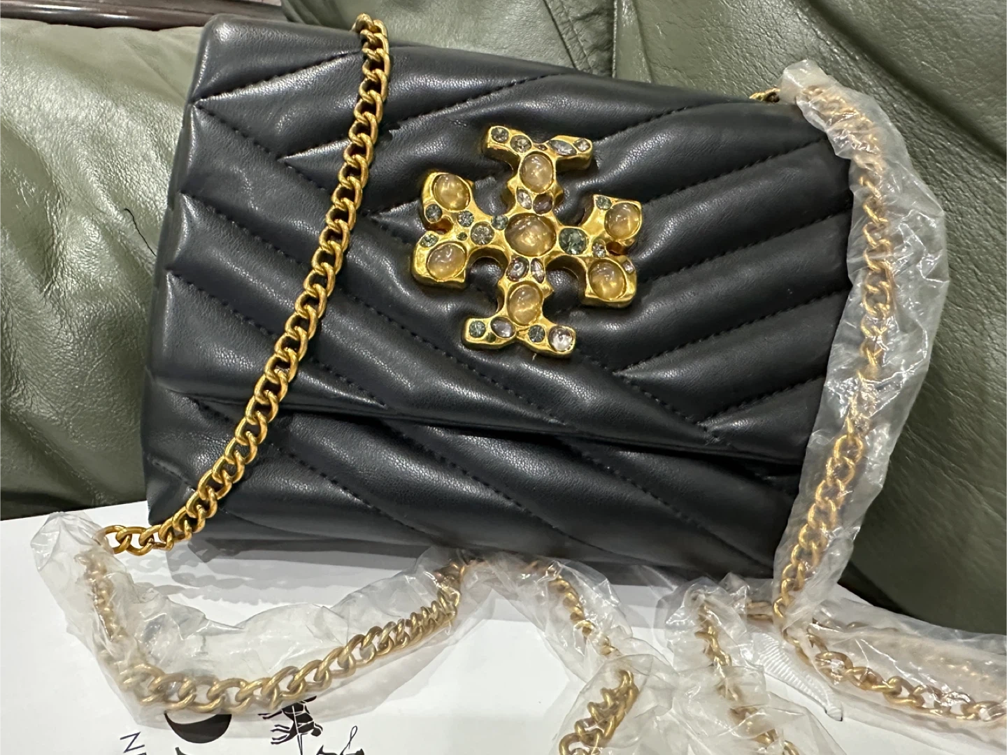 Tory Burch Kira Chevron Small Flap Bag. It's black leather with gold-tone hardware and a jewelled logo. This bag has a chain strap.